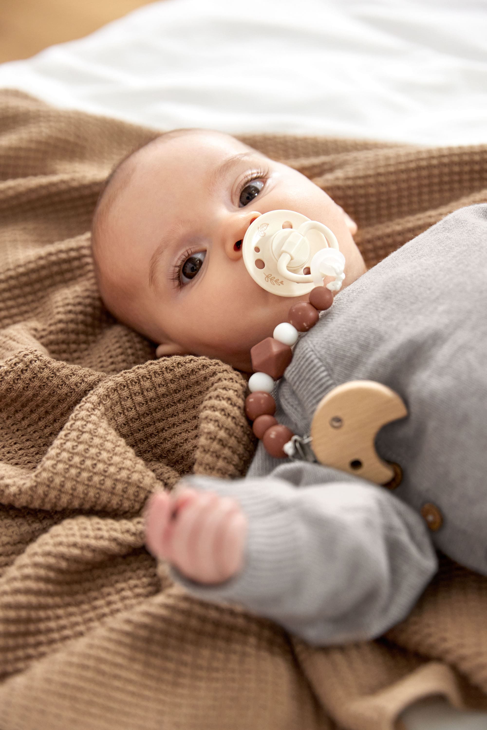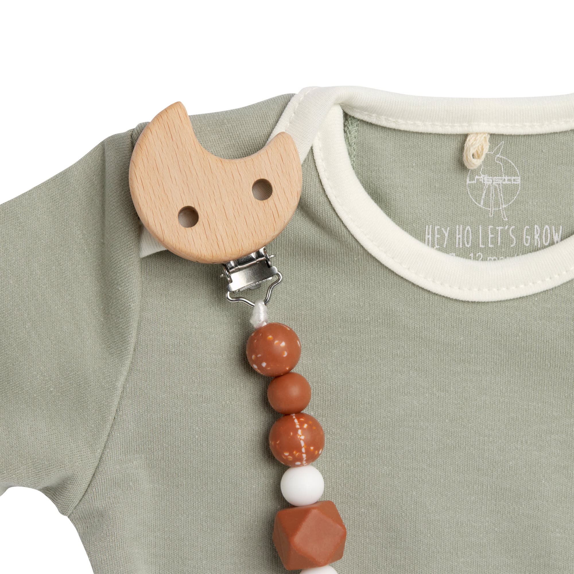 With the Lassig Soother Holder from the Little Universe collection, no pacifier will ever get lost again. The BPA-free Soother Holder consists of a wooden clip with metal closure as well as a silicone chain and a silicone ring for attaching the pacifier to. The moon theme is sure to arouse your child's curiosity about the vastness of the universe. The clip can be readily attached to clothing. The flexible silicone ring allows the Soother Holder to be attached to pacifiers with or without a ring. The silicone ring grips the pacifier tight, ensuring that it does not come loose.