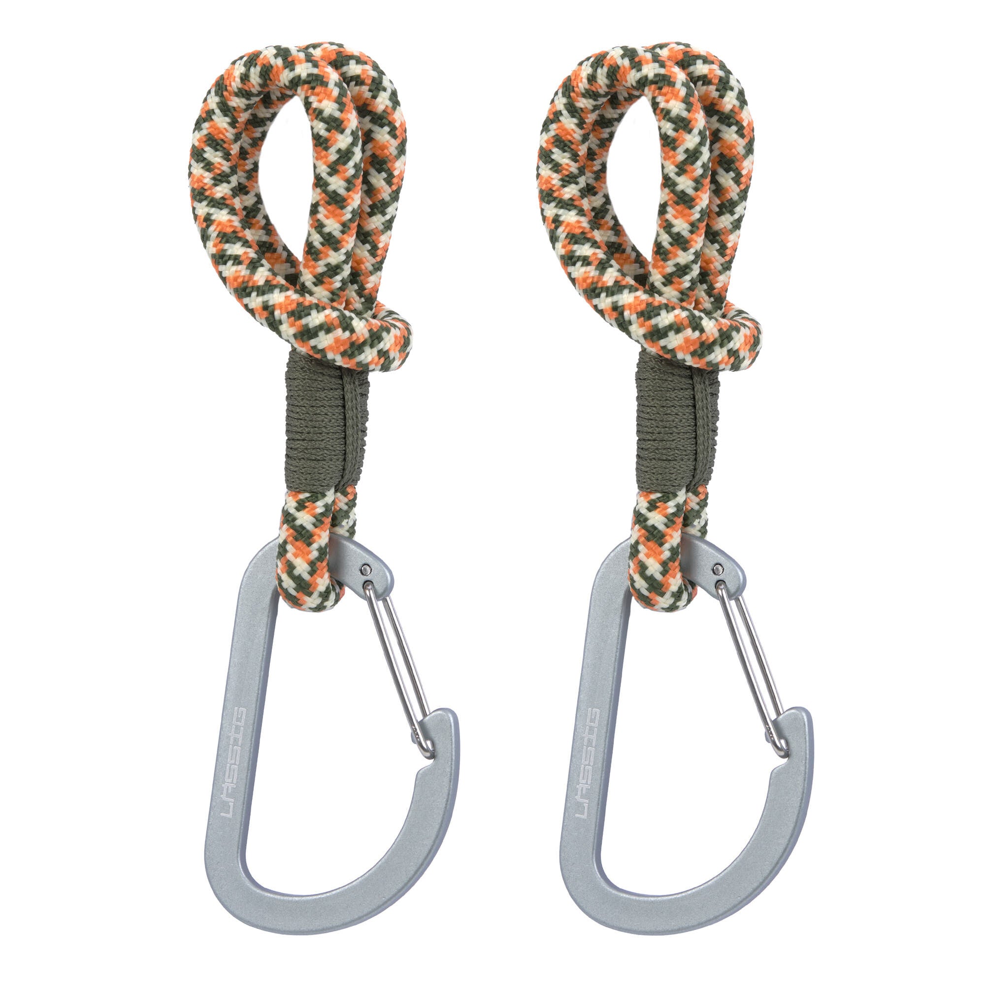 The set consists of two hooks and fits all standard prams and pushchairs. But the practical hooks can also be easily attached to bicycle trailers, bicycles, walking aids, shopping trolleys or as fashionable bag tags. With the flexible cord made from recycled yarn, the fastening loops adjust variably to the respective handle thickness.