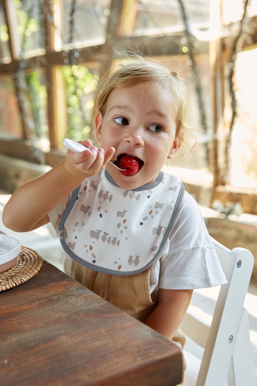 With these waterproof sets of five bibs from Lassig, little gourmets can spill their food without feeling regret. The organic cotton is carefree . The bibs are perfect for children from 6 to 24 months. The bibs that are sold in multiple assortments have a hook and loop tape fastener on the reverse side and are made of easy-care organic cotton/polyester mix and feature a waterproof interior lining to keep baby's clothing underneath absolutely dry. The set of five is available in various colors, with and without pattern. The bibs are machine-washable at 40°C. Tip: Fasten hook and loop tape straps before washing.