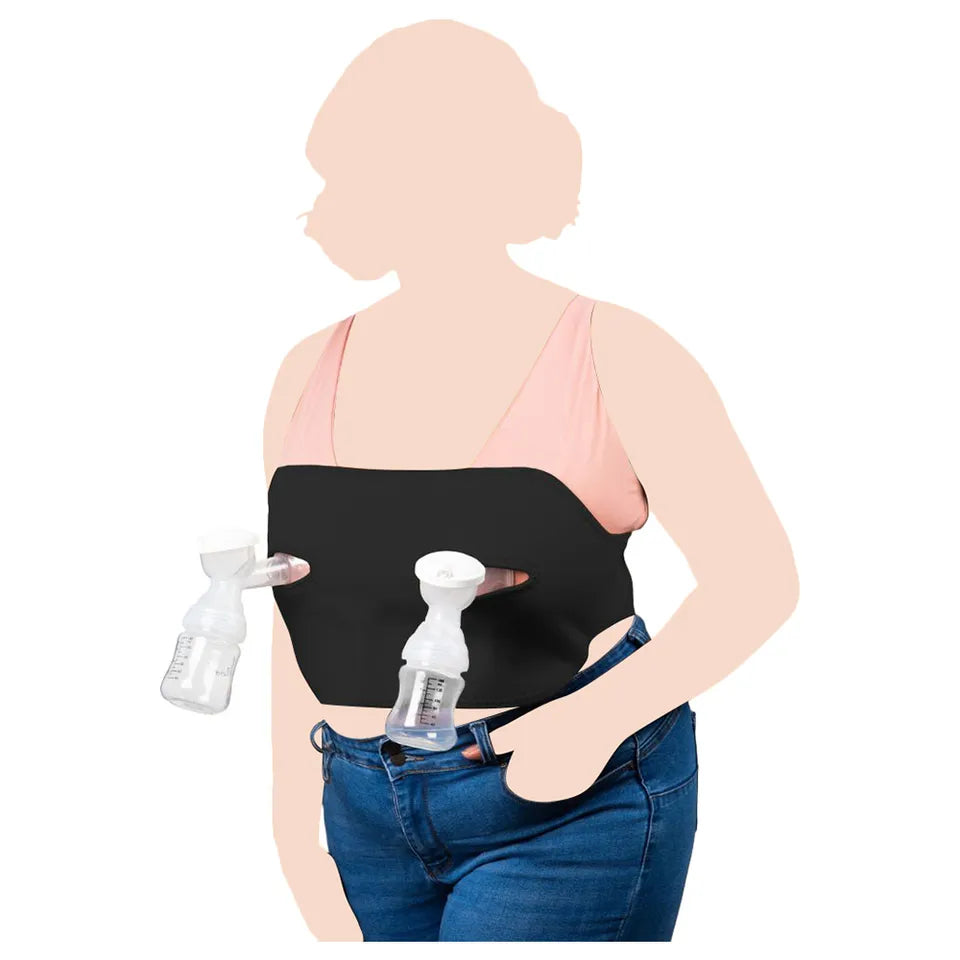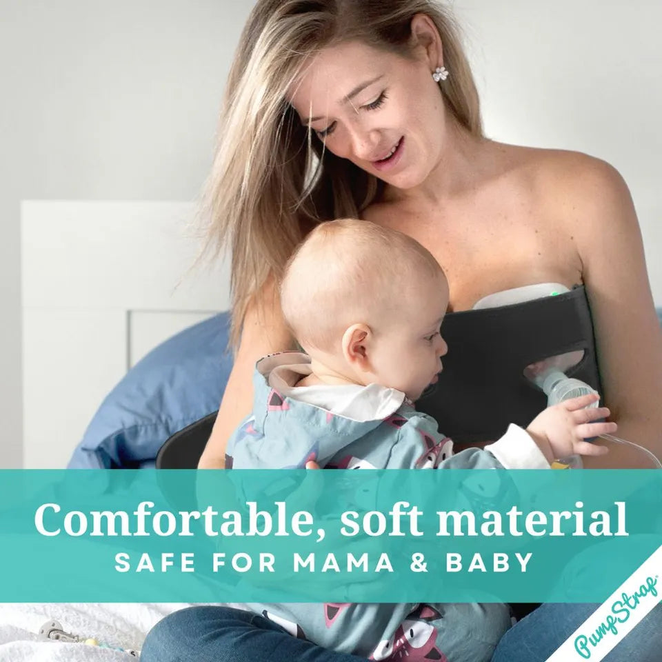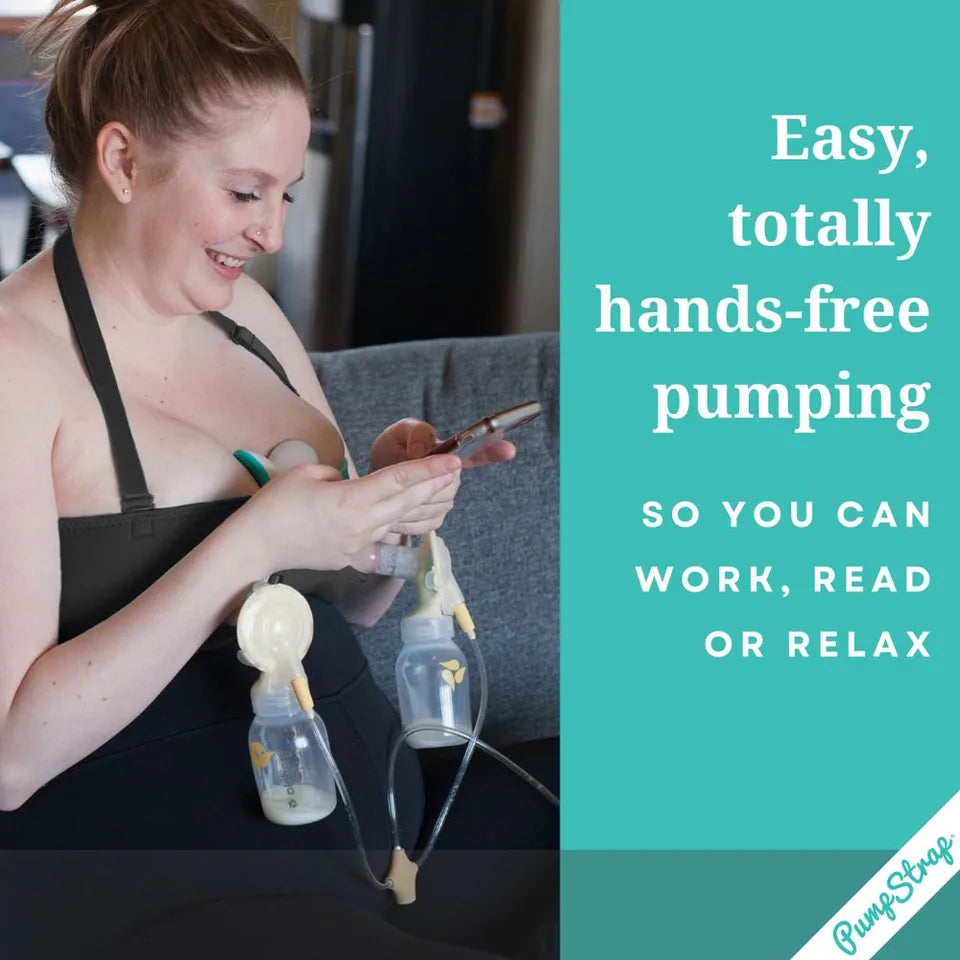 The Pump Strap Bra is the Lactation Specialist recommended hands-free pumping bra that allows you to pump both breasts simultaneously or pump while breastfeeding. Wear by itself or over a nursing bra or nursing top without having to fully undress every time you want to pump! The adjustable pump bra fits all women sizes XS - XXL+, bra sizes A - J (see size guide below). , , Adjusts with you during any and all stages of your postpartum pregnancy body. Simple, effective, machine washable design with sturdy velcro closure (extra bra strap included for even more support). Save time with our fast on, fast off design - no need to fully undress. The Pump Strap's breast openings are easy to maneuver so you can insert your pump flanges quickly and easily. Machine wash and hang to dry. Works with all single and double electric breast pump manufacturers including, but not limited to Medela, Spectra, Unimom, and Ameda.