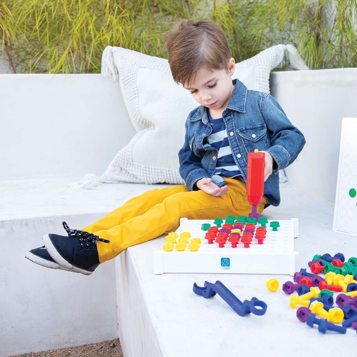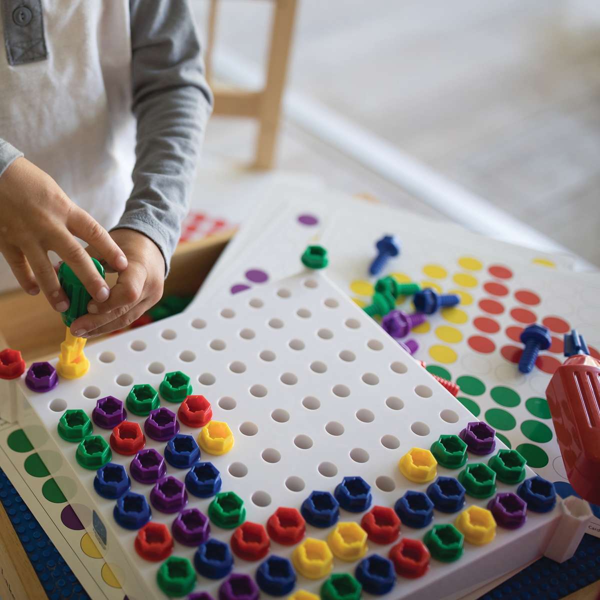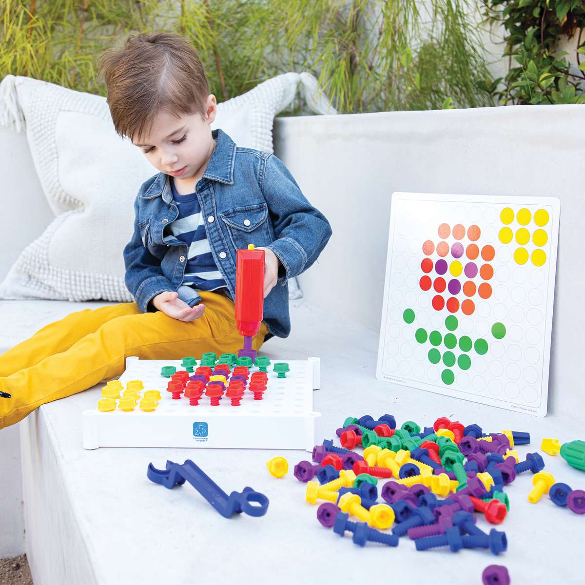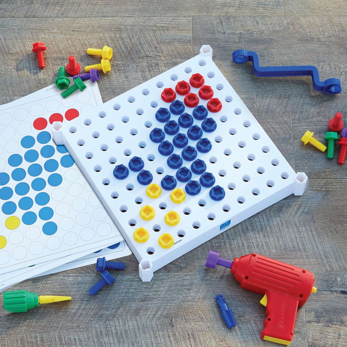 - Set includes: 10 double-sided pattern cards providing 20 full-colour activities, 100 plastic bolts in 5 vibrant colours