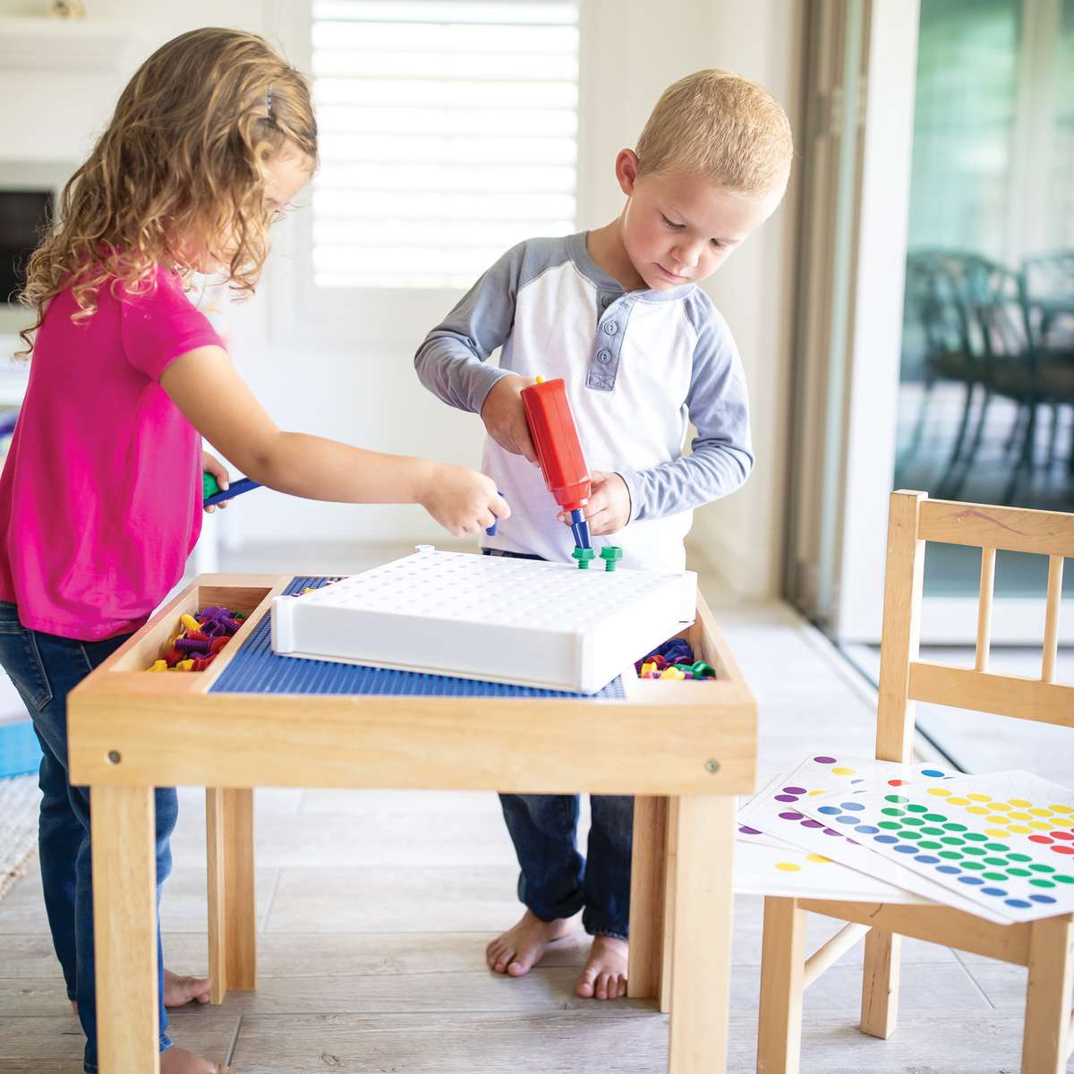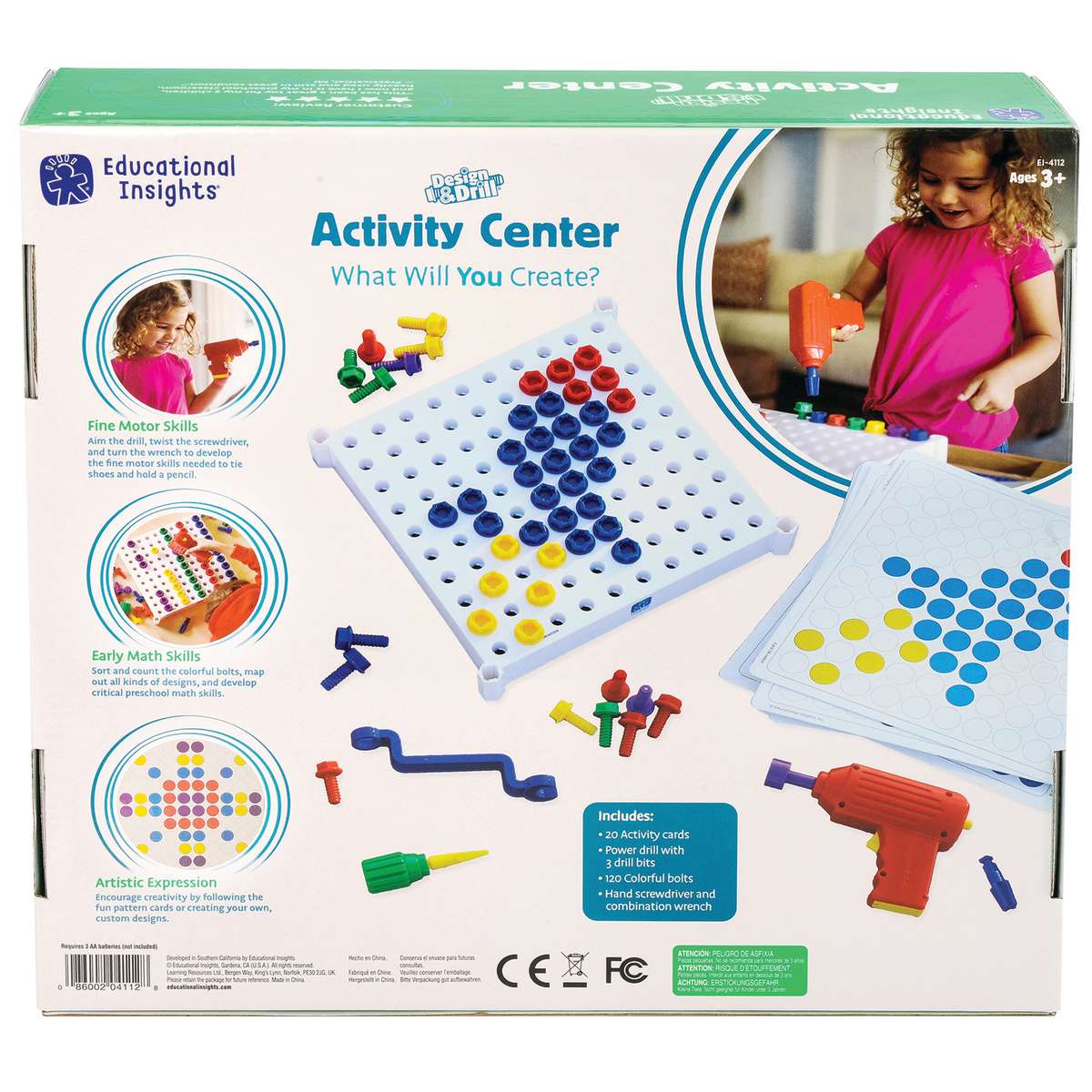 Children develop coordination and early STEM skills as they use a working toy drill and chunky bolts to complete colourful designs on a sturdy activity board. The Design & Drill Activity Center introduces sorting, counting, and patterning, helping to build early maths concepts while encouraging creativity and fine motor development. Set includes 20 easy-to-follow design cards and is built to withstand energetic play. Requires 3 AA batteries (not included).