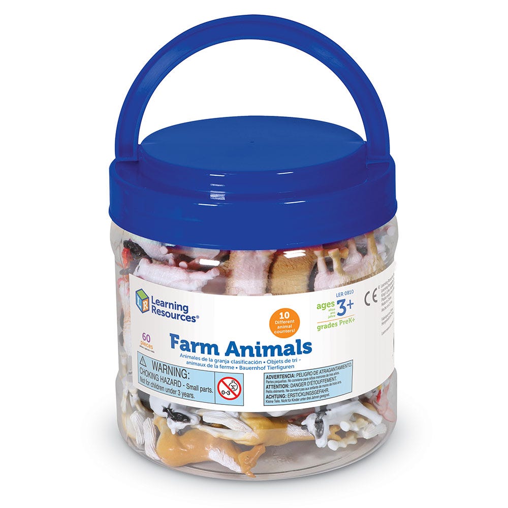 Children as young as 3 can develop their basic counting, sorting and repeated pattern skills with these fun farm animals. These math manipulatives are a great way to keep little learners engaged and motivated. They’ll think they’re playing make believe... you’ll know they’re learning! Counters can be combined with other counter sets for endless playing possibilities! Largest figure (horse) measures 2”x2”. Includes 60 animals and a convenient storage bucket!