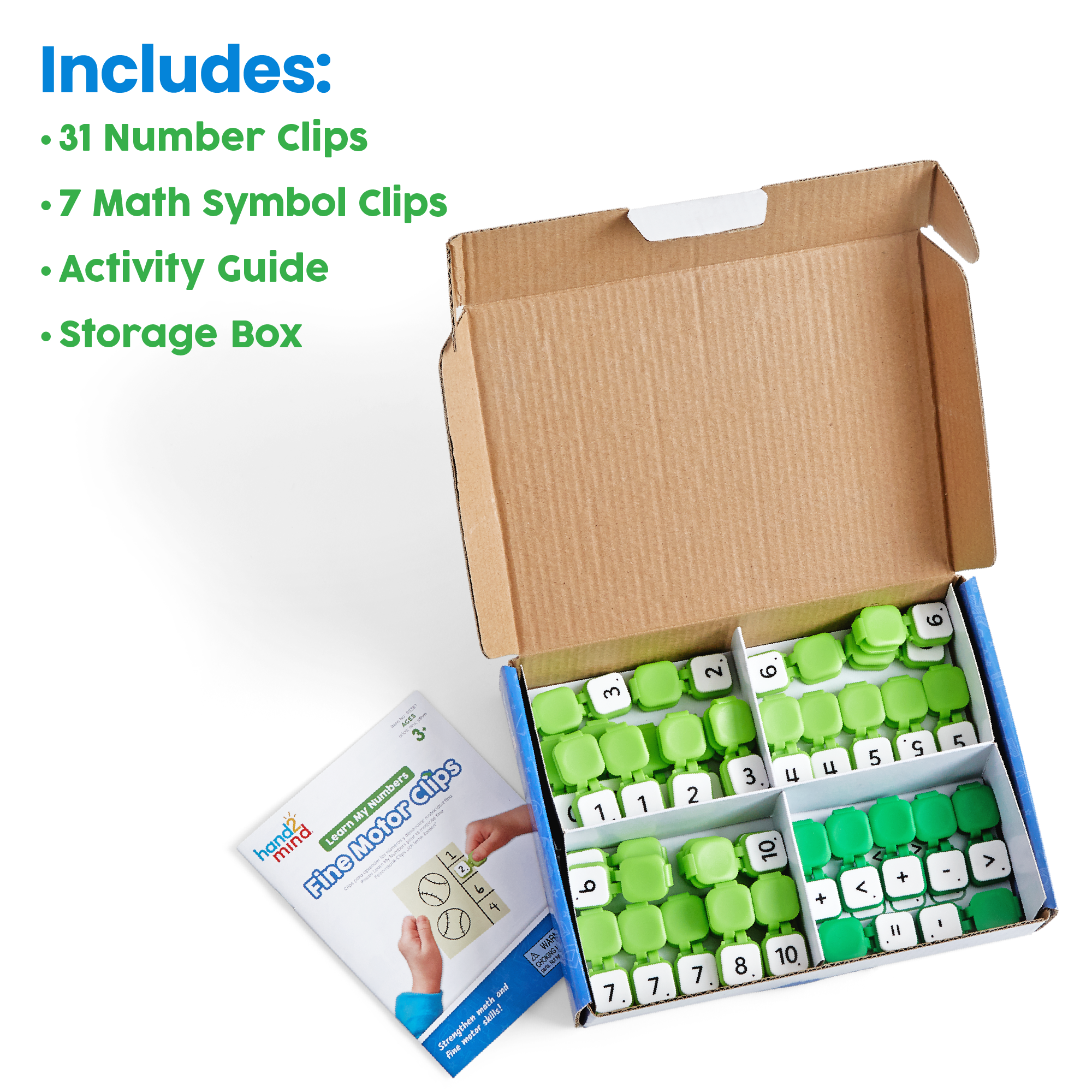 Use for number grouping, addition, subtraction, and more! Clips are designed with little hands in mind and are perfectly sized for little fingers. Durable, ergonomic design helps build and refine fine motor skills like the pincer grasp, so children will strengthen their fingers while learning early math skills! The box is designed to sort and store the clips. This set includes 31 Number Clips (Numbers 0-10), 7 Math Symbol Clips (addition, subtraction, equal to, greater than, and less than), and an Activity Guide. For over 50 years, hand2mind has encouraged hands-on learning and discovery, driving deeper understanding and helping children unlock their full potential. Hand2mind specializes in literacy activities and products designed to help students learn by doing. With products designed to help students with reading comprehension, sentence building, phonics for toddlers and more. We're also a leader in autism learning materials and dyslexic tools for kids who have a tougher time getting started with reading. From early reading to advanced reading, hand2mind has you covered with products designed to enhance learning in the classroom and the world around us. Through hands-on exploration and discovery we strive to find new ways to encourage students in math practice, literacy activities, STEM education and more!