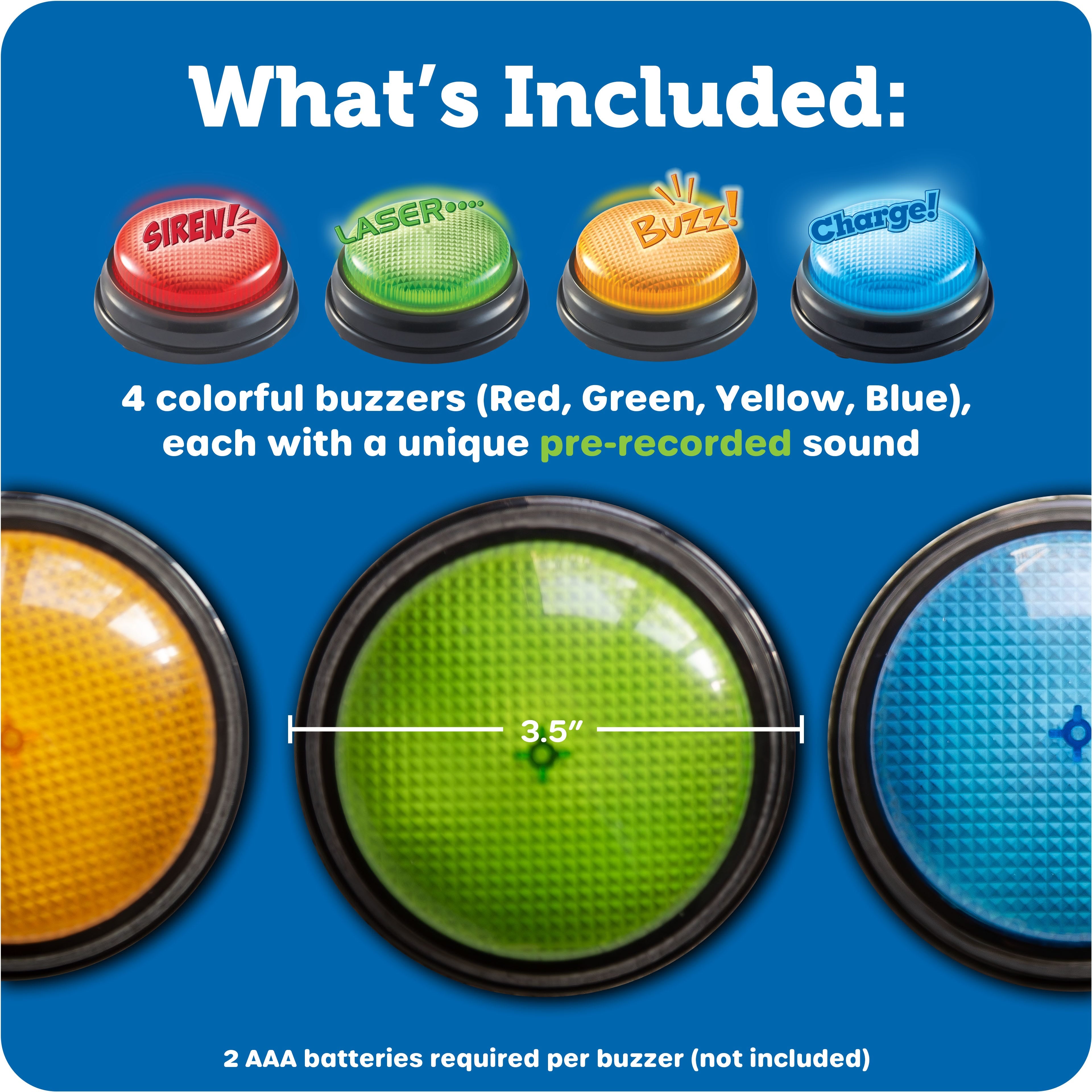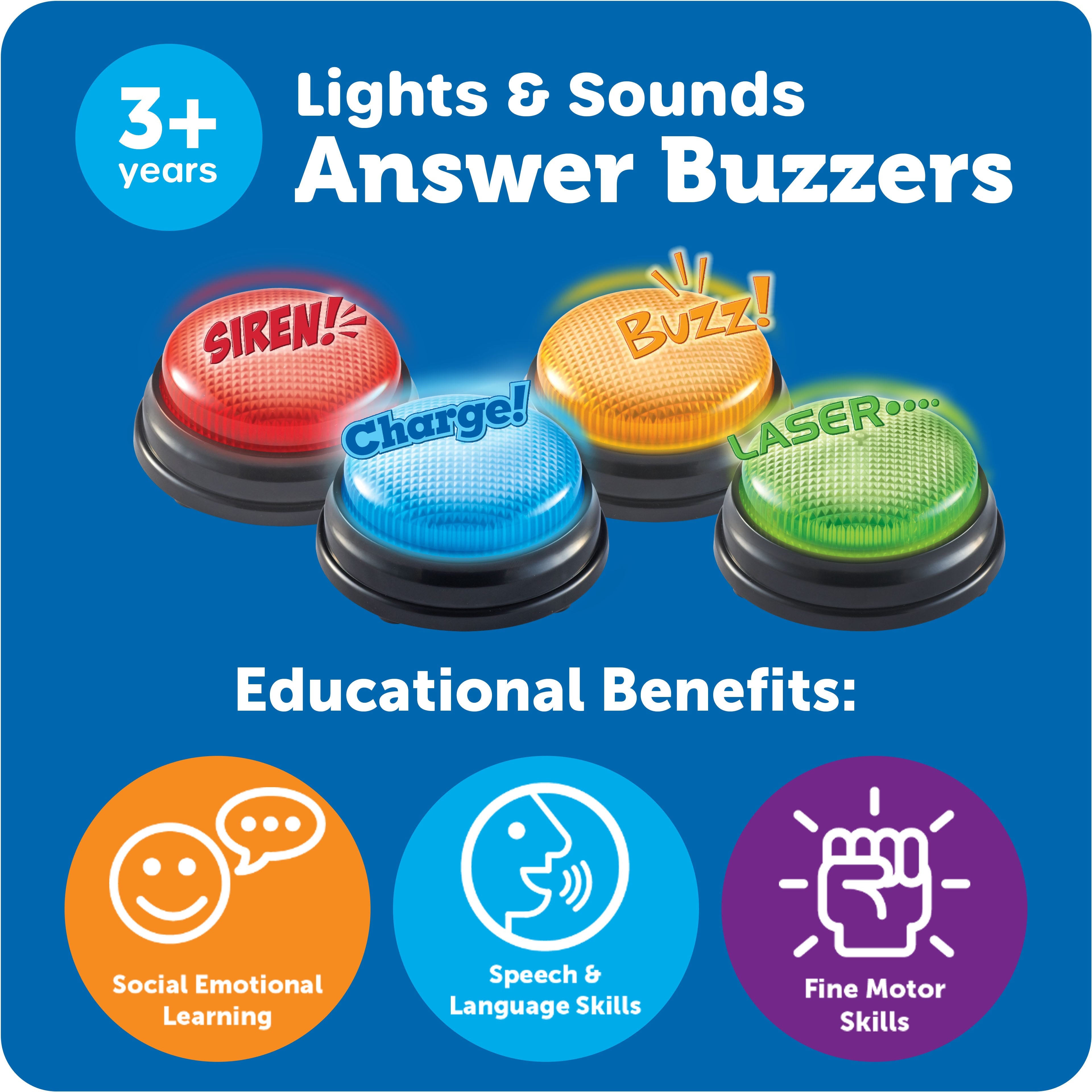 Learning Resources Lights & Sounds Answer Buzzers (Set of 4). These fun, colourful buzzers turn any activity into a game while keeping even the youngest children engaged! Set includes four brightly coloured buzzers (blue, red, green and yellow) that light up when pressed. Each buzzer features a unique sound for easy differentiation - siren, game-show, laser and charge!