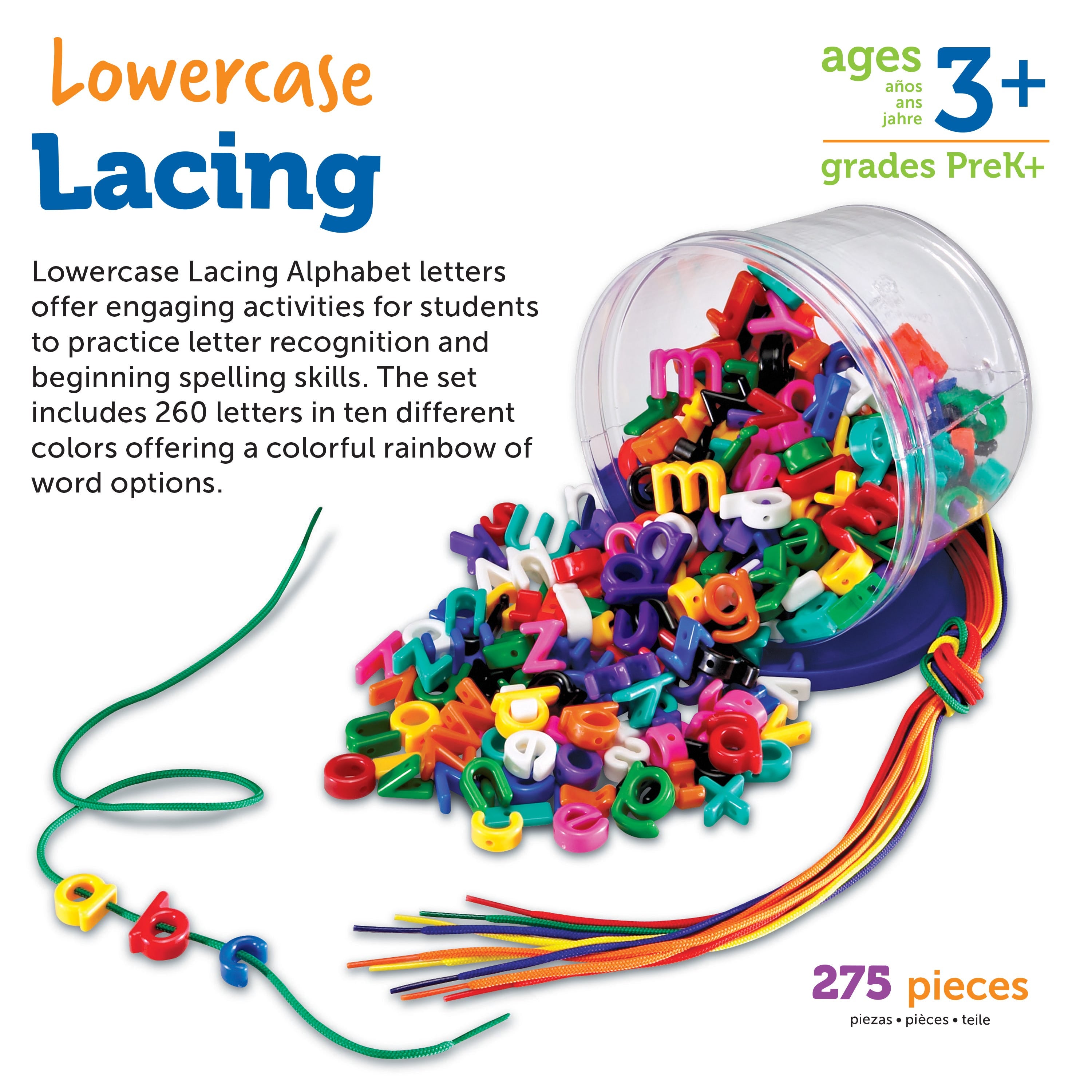Practise letter recognition, patterning, sorting and more with this colourful lacing set. Children develop their hand-eye co-ordination as they string along 4cm high letters. Set includes 15 laces and a storage bucket.
