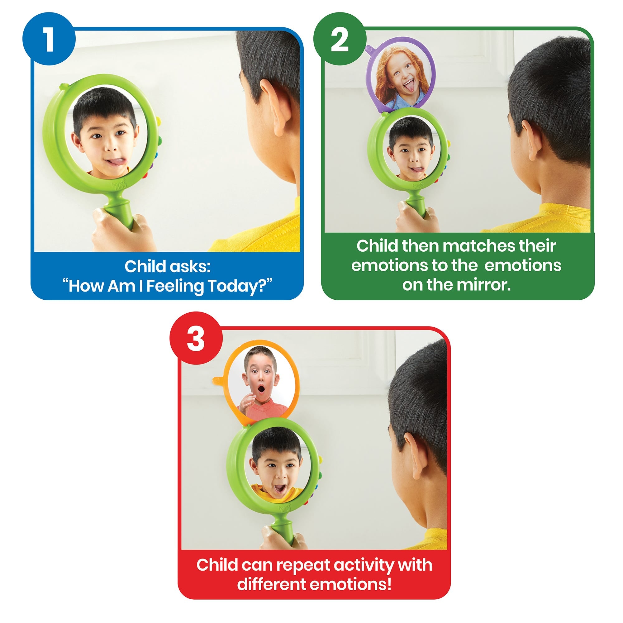 Learning Resources See My Feelings Mirror helps your students learn to label and identify their emotions with the See My Feelings Mirror. Make learning and understanding feelings fun with four guided starter activities, easy-to-identify emojis, and six different snap-in-place emotion slides. Photos show real children expressing real emotions: happiness, surprise, fear, sadness, silliness and anger. Mirror is made from shatterproof glass to ensure safety. Mirror is made from shatterproof glass to ensure safety.