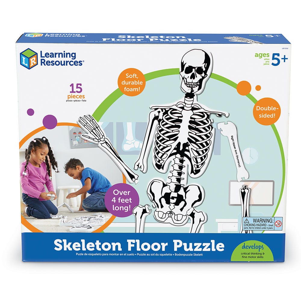 This large-size Skeleton Floor Jigsaw Puzzle will spark curiosity about science and human anatomy! Kids will learn all the major bones as they assemble the 15 pieces of this soft foam puzzle. Gives budding doctors a hands-on, interactive way to learn about the human skeletal system. The Learning Resources Skeleton Floor Jigsaw Puzzle Features: 15 soft foam puzzle pieces Names of bones printed on backs of each piece Dramatic 4 foot size when complete