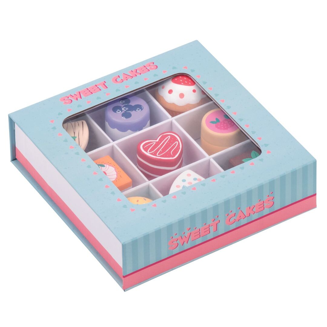 Encourages imagination skills. 9 piece cake with different toppings and different flavors in a delicate gift box.