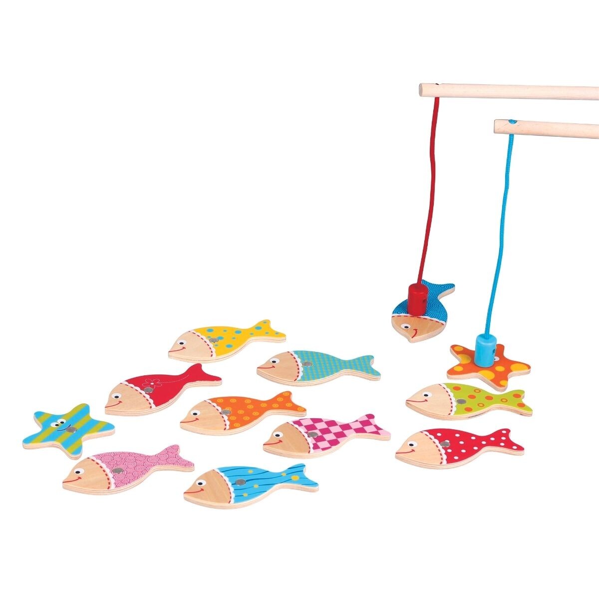 Lelin Wooden Toys Magnetic Educational Puzzle Fishing Game With Magnetic Rod and Fishes. 10 beautiful decorated tropical fishes and 2 starfishes in a smooth wooden frame. Each fish has a magnetic stud. Its a two player game comes with two magnetic fishing rods. Item is made in high quality materials and safe for kids. Ideal gift to little one and will surely provide endless hours of fun.