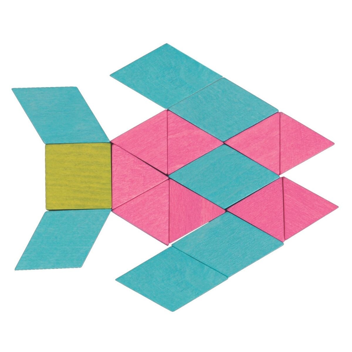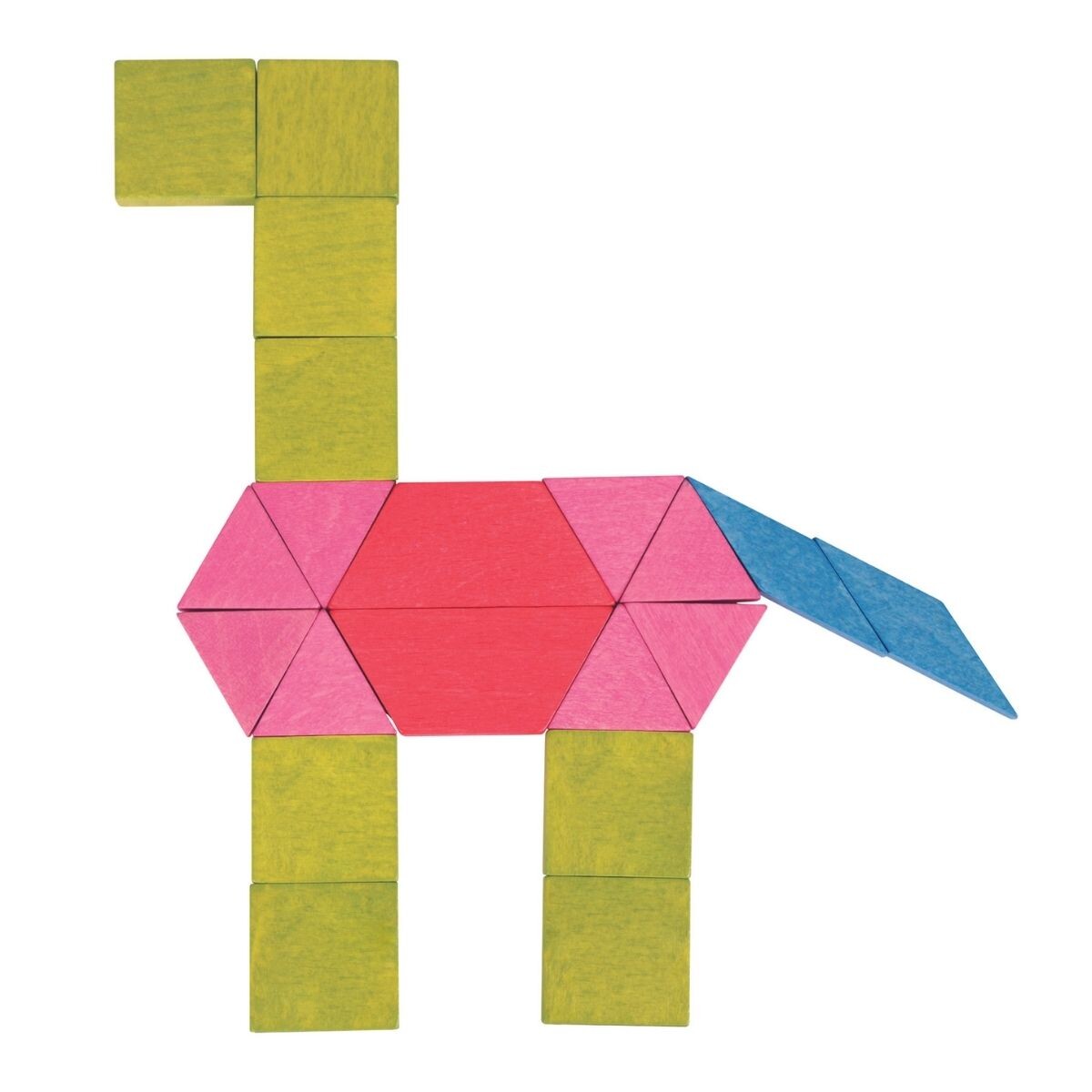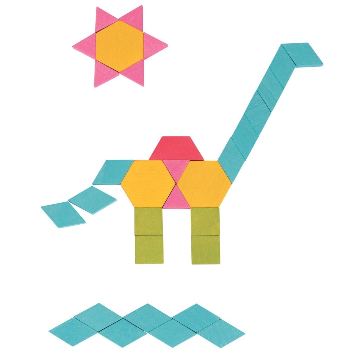 The Mosaic Blocks are a set of wooden blocks designed for children to create patterns and designs. The set typically includes a variety of colored wooden blocks that are of different shapes and sizes.