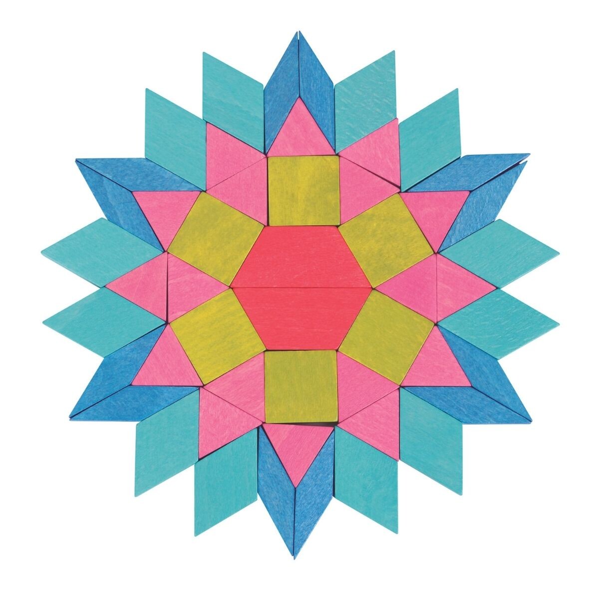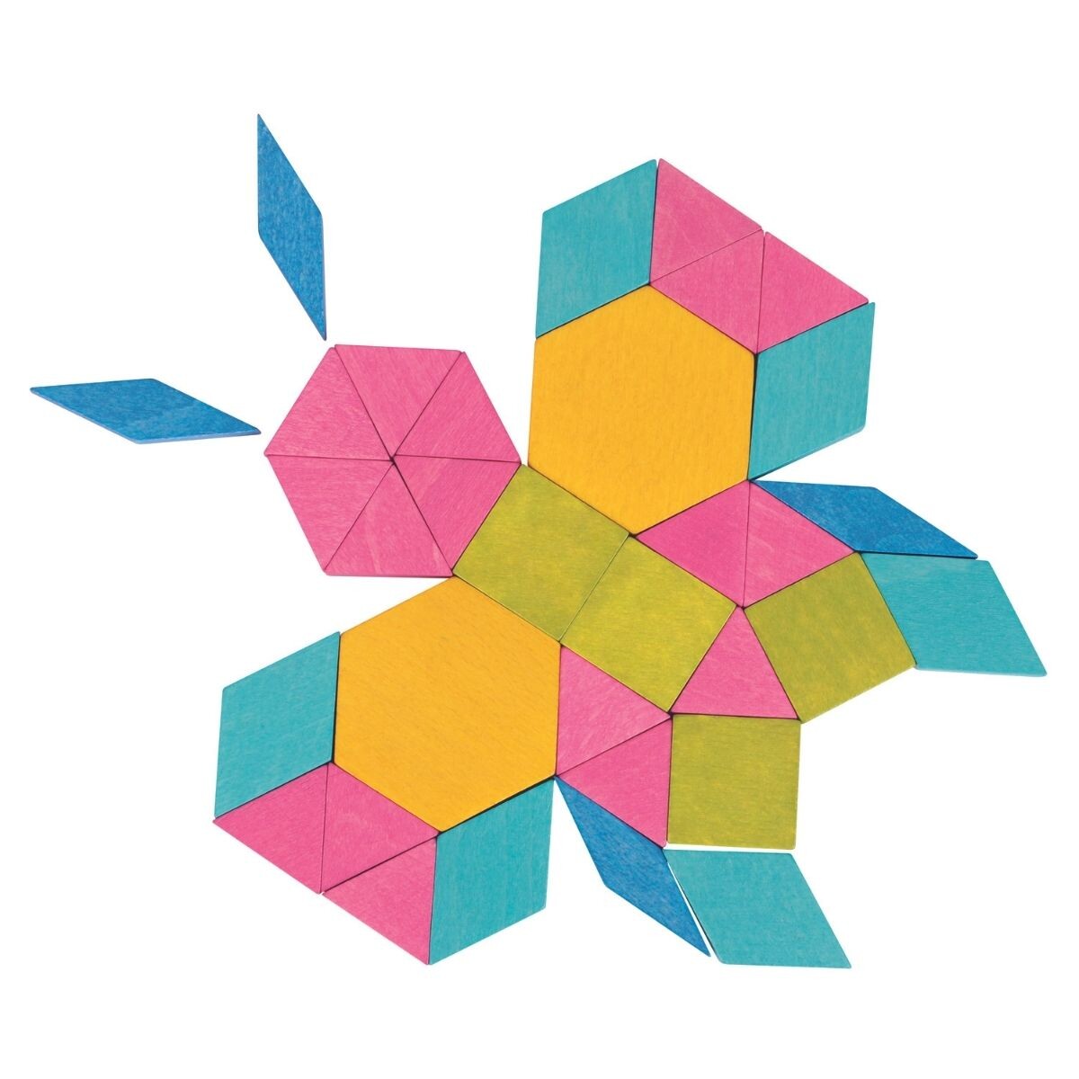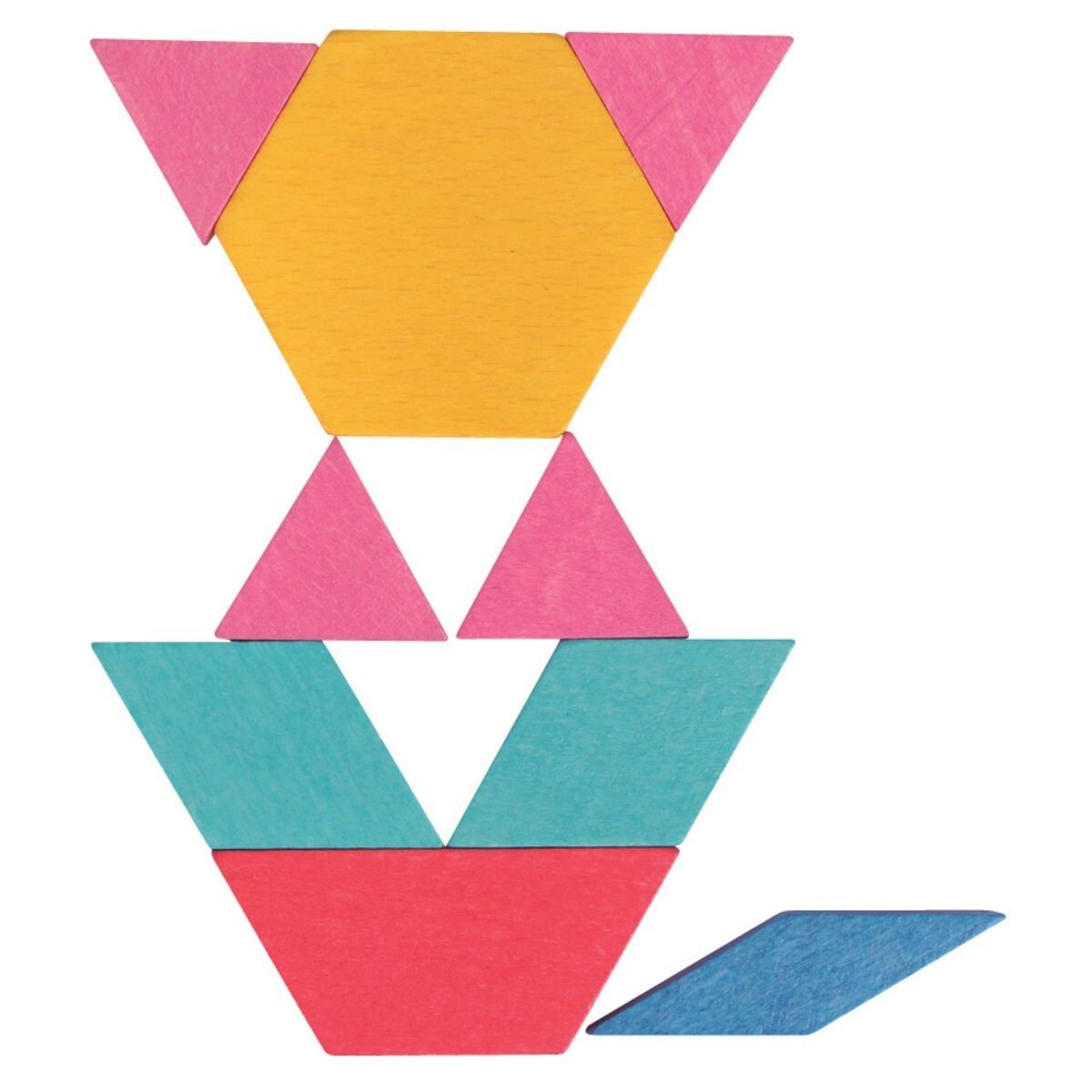 The Mosaic Blocks are a set of wooden blocks designed for children to create patterns and designs. The set typically includes a variety of colored wooden blocks that are of different shapes and sizes.