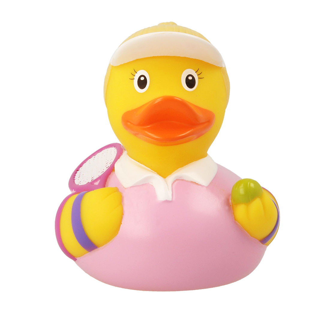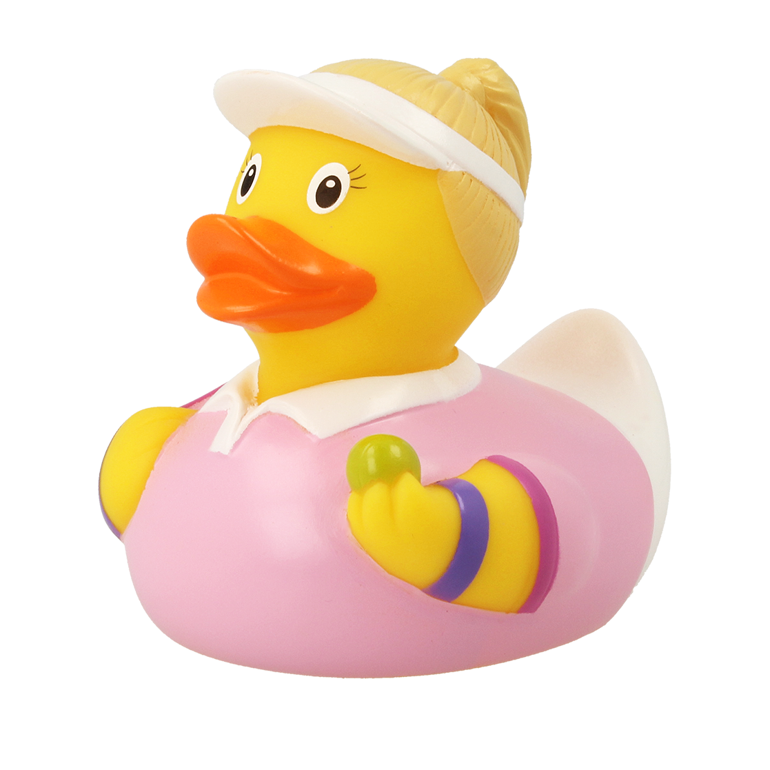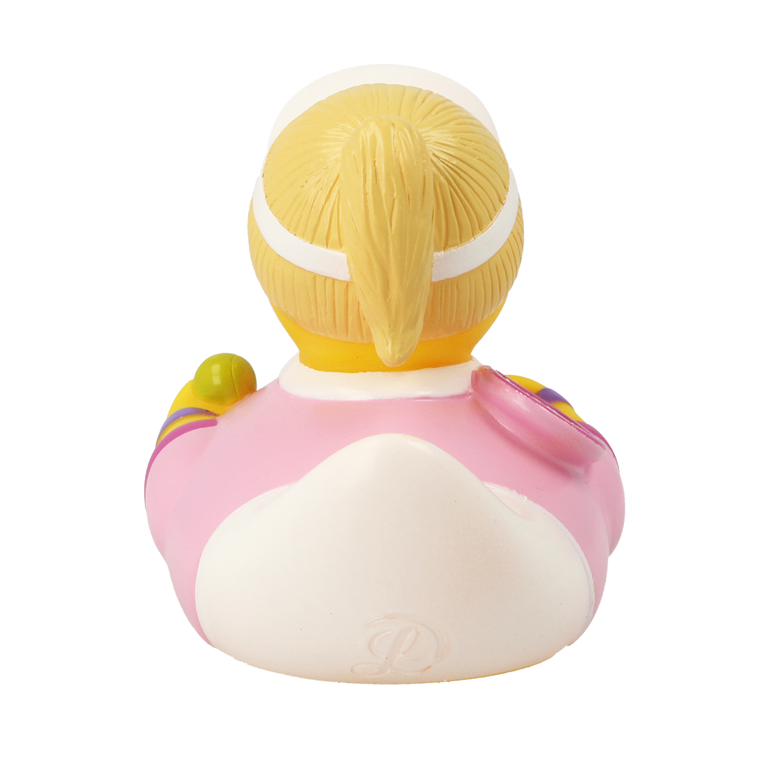 This female tennis player is practicing hard to win the Wimbledon from her childhood. She looks cute with her pink outfit and her pink racket. She defeats every rubber duck with her skills.