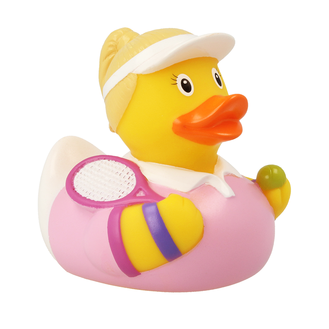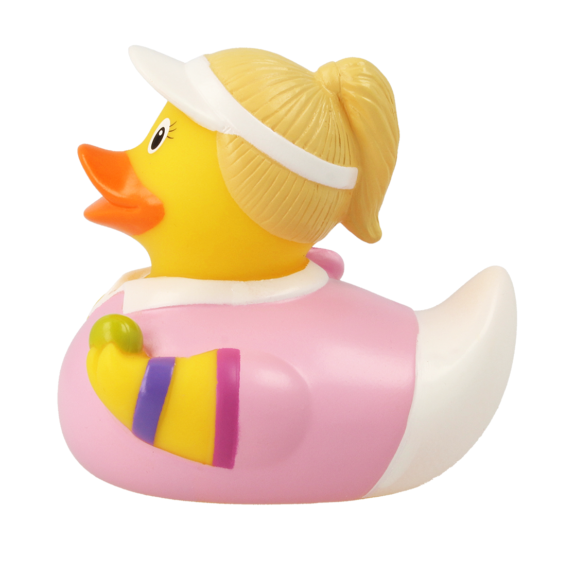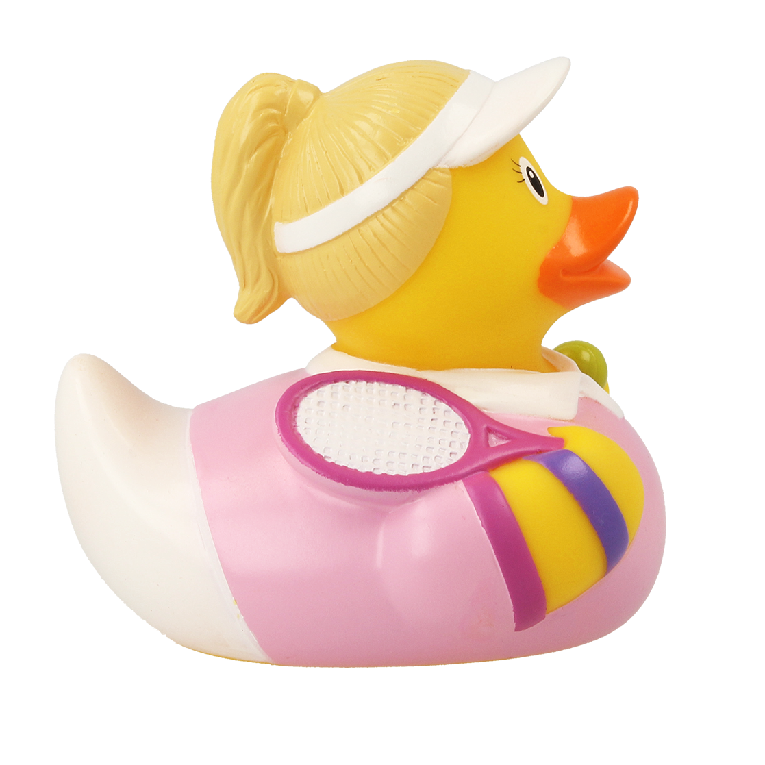 This female tennis player is practicing hard to win the Wimbledon from her childhood. She looks cute with her pink outfit and her pink racket. She defeats every rubber duck with her skills.