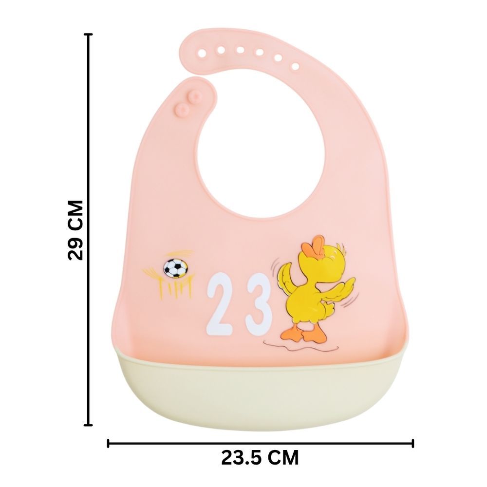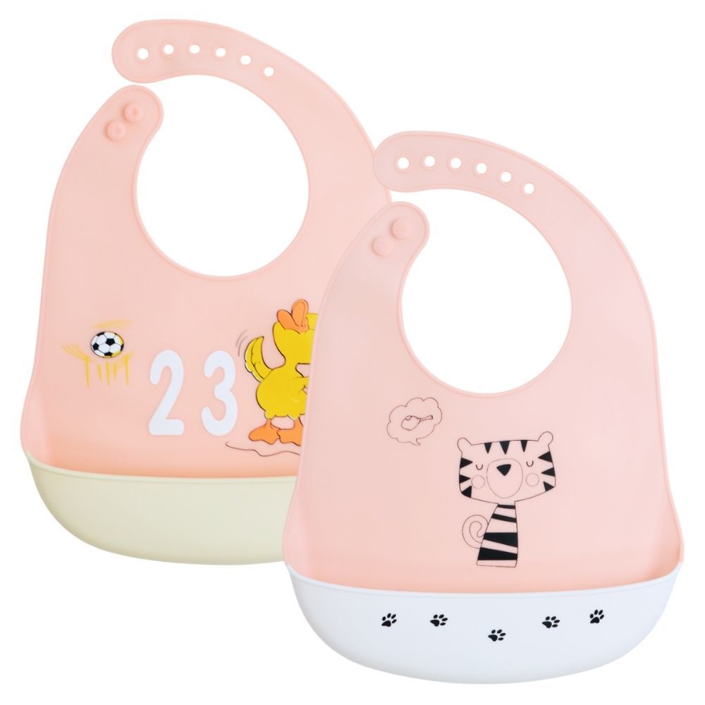 This adorable pair includes one peach bib with a cheerful tiger illustration and one bib featuring a cute chick playing football with number “23” — perfect for adding fun to every bite! Made from soft, food-grade silicone, these bibs are gentle, waterproof, and mess-proof. The deep catcher pocket keeps your baby’s clothes clean, while the adjustable neck ensures a comfortable fit for all ages. Easy to wipe, wash, and roll up — these bibs make feeding time simple and joyful! ??