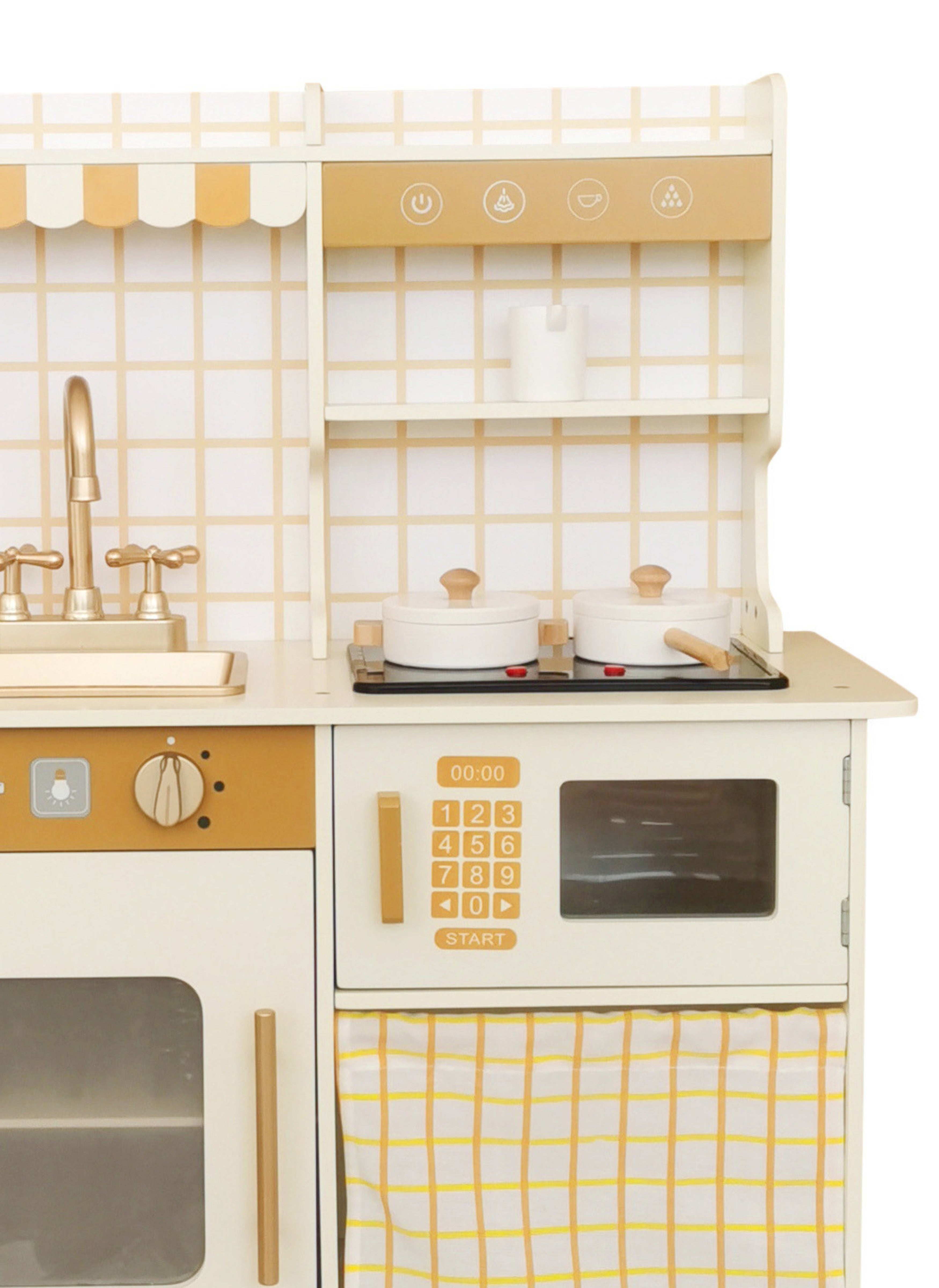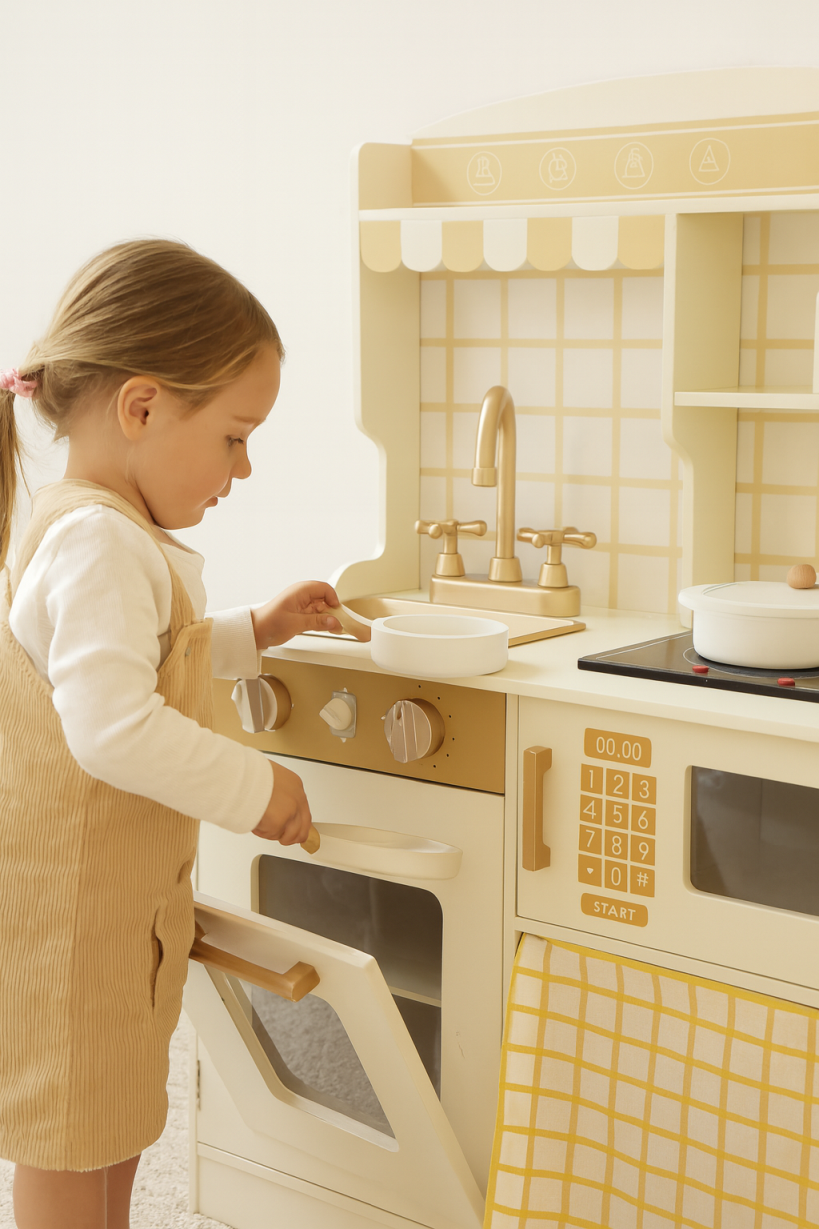 The Little Angel Kids Wooden Kitchen Set (W08810) Is A Beautifully Designed Pretend Cooking Toy For Toddlers And Kids. With Its Bright Yellow-And-White Color Scheme, It Includes A Stove, Oven, Microwave, Sink, And Shelves For Interactive Play. Featuring Realistic Knobs, Movable Doors, And Playful Details, This Educational Wooden Toy Kitchen Encourages Creativity, Role Play, And Motor Skill Development. Made From Eco-Friendly, Non-Toxic Wood, It Is Safe, Sturdy, And The Perfect Gift For Little Chefs Who Love Kitchen Play.