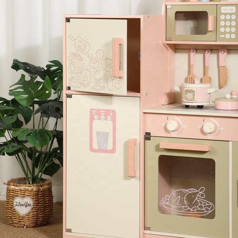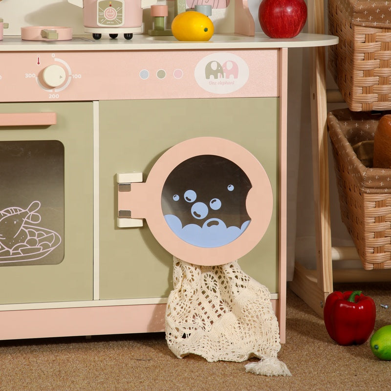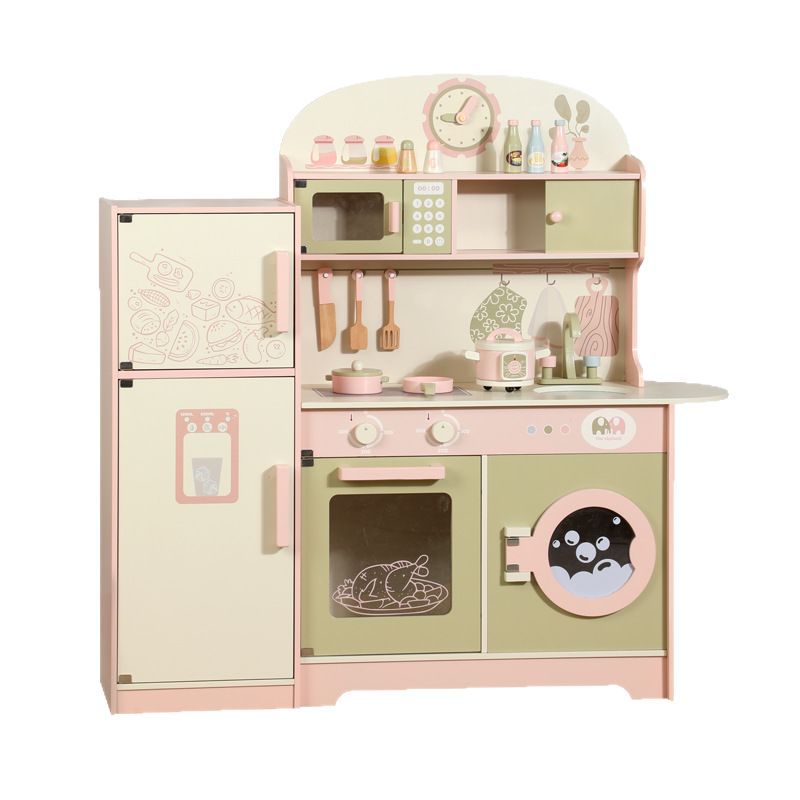 The Little Angel Kids Wooden Kitchen Playset Is A Premium Pretend Cooking Station Designed With A Fridge, Stove, Oven, Sink, Microwave, Washing Machine, And Storage Shelves. Styled In Elegant Pastel Cream, Green, And Pink Tones, It Makes An Eye-Catching Centerpiece For Any Playroom Or Nursery.