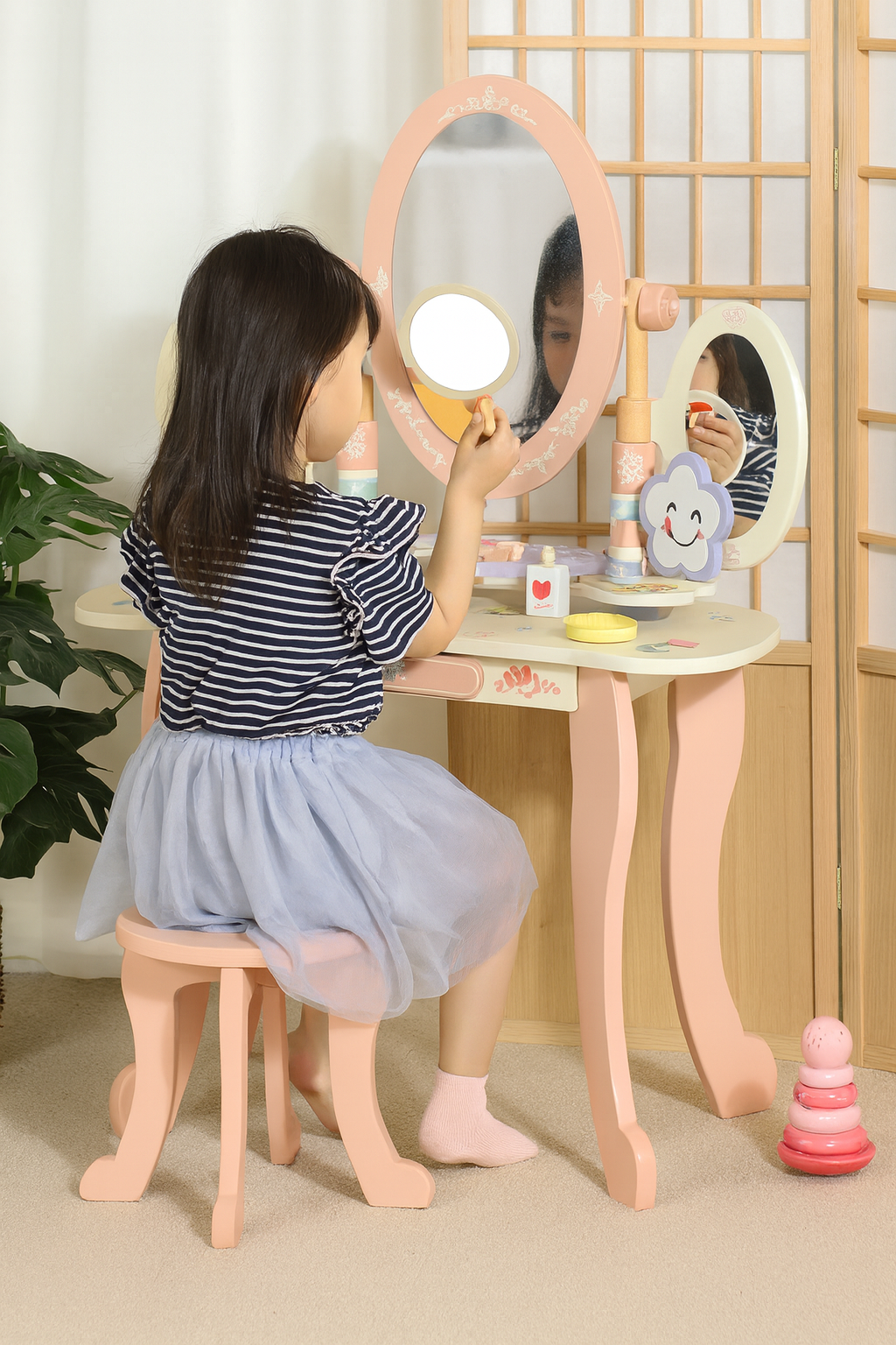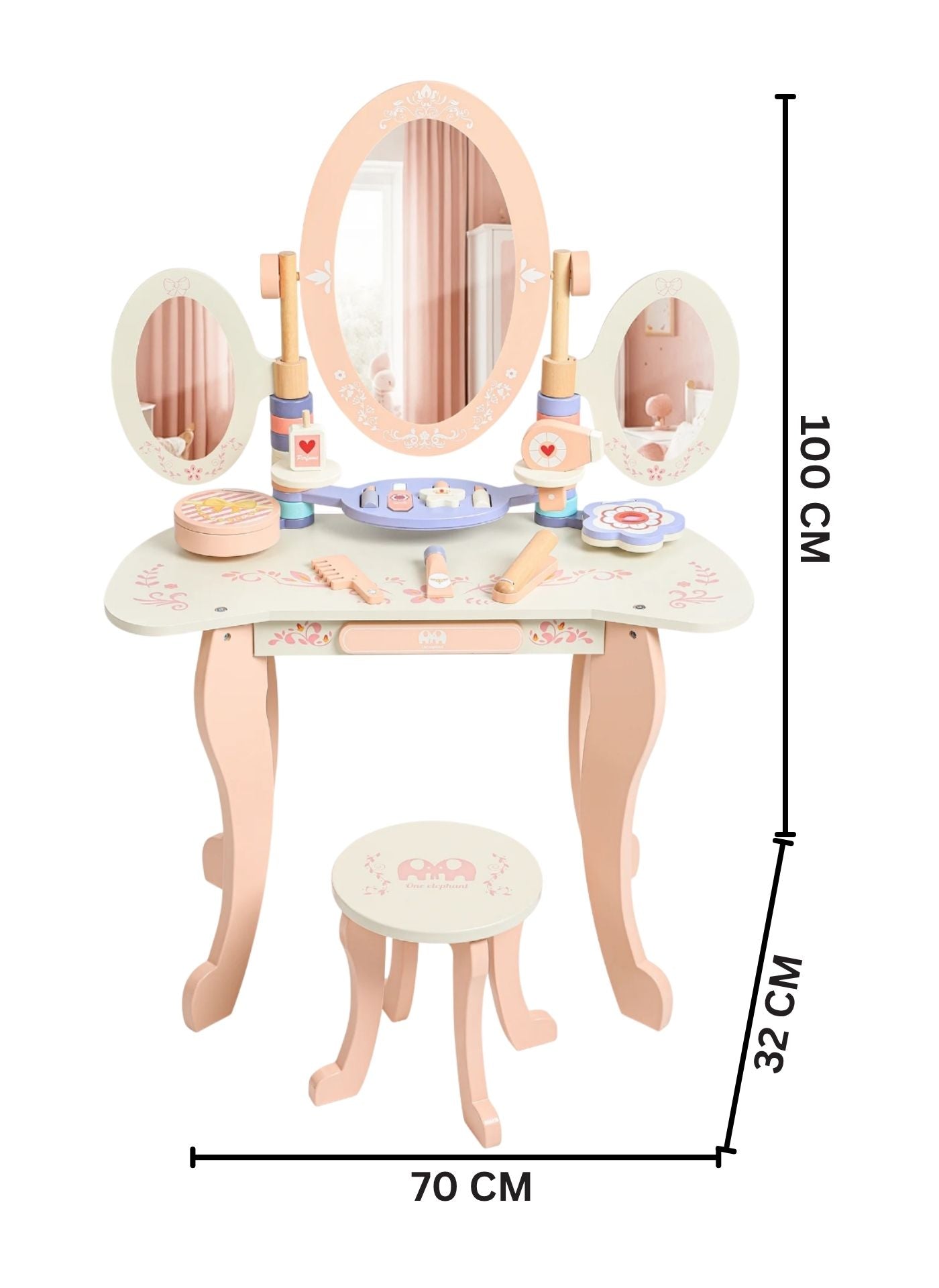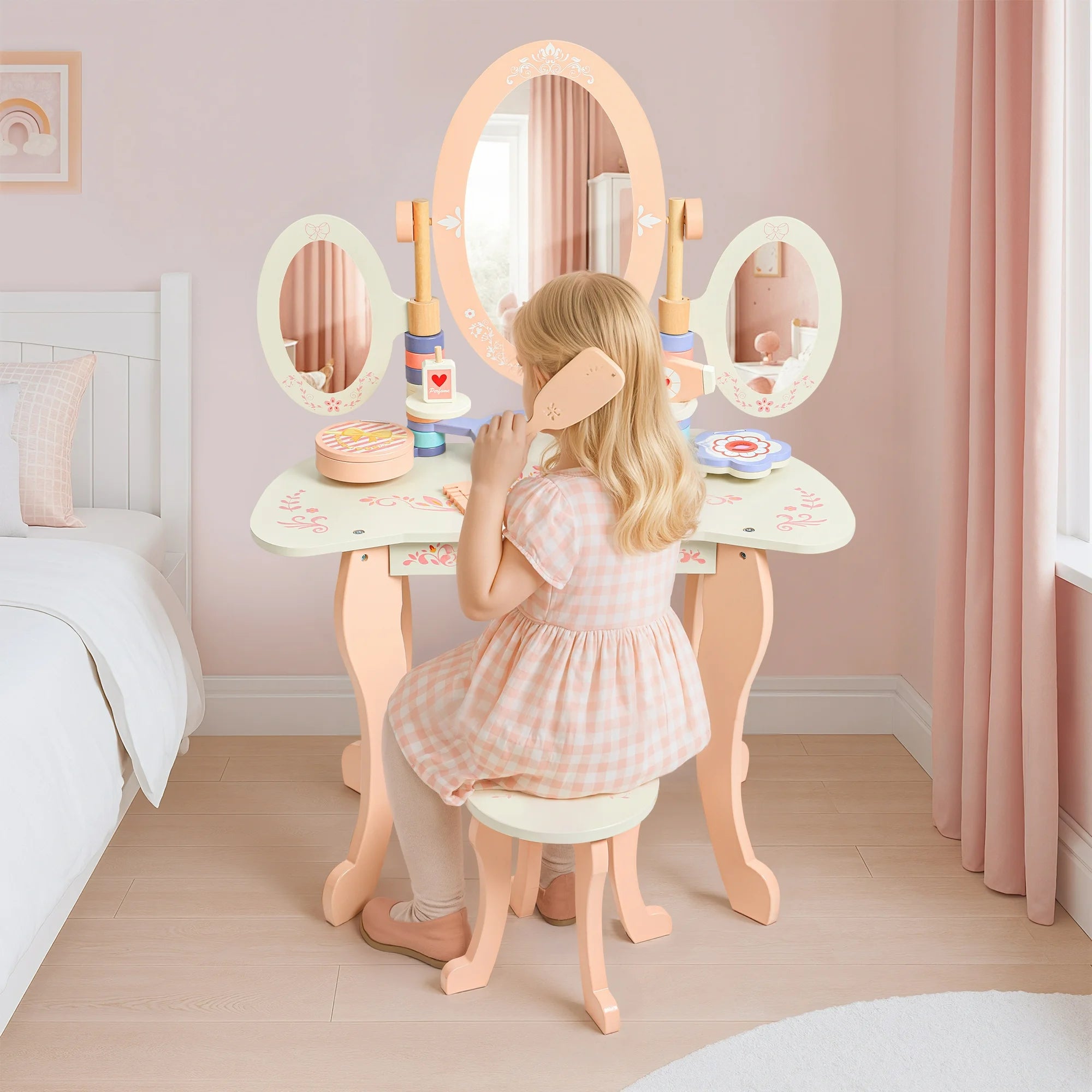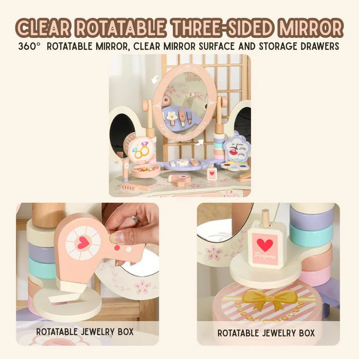 Introduce Your Child To Spark Imaginative Play With This Elegant Wooden Princess Vanity Playset, Featuring A 3 Mirror, Stool, And Storage Drawer In A Soft Pink Finish. Complete With Realistic Wooden Beauty Accessories—Brush, Perfume Bottle, Lipstick, And Nail Polish—This Role-Play Makeup Table Encourages Fine Motor Skills And Creative Storytelling. Crafted From High-Quality, Eco-Friendly Wood, This Durable Pretend Play Furniture Is Safe For Little Ones And Perfect For Girls Aged 3 And Up. Whether As A Birthday Gift Or A Stylish Playroom Addition, The Little Angel Vanity Playset Builds Confidence, Social Skills, And Hours Of Fun.