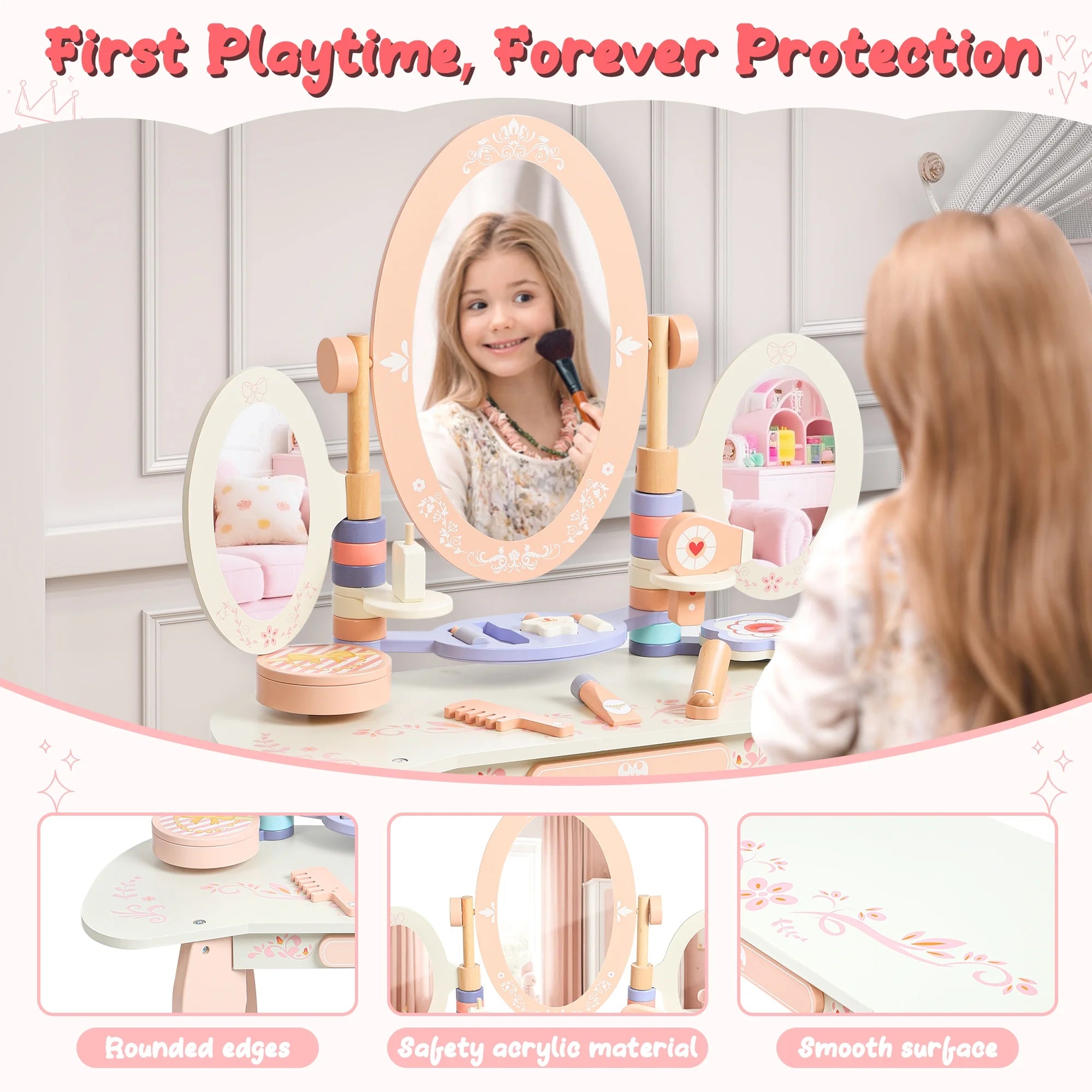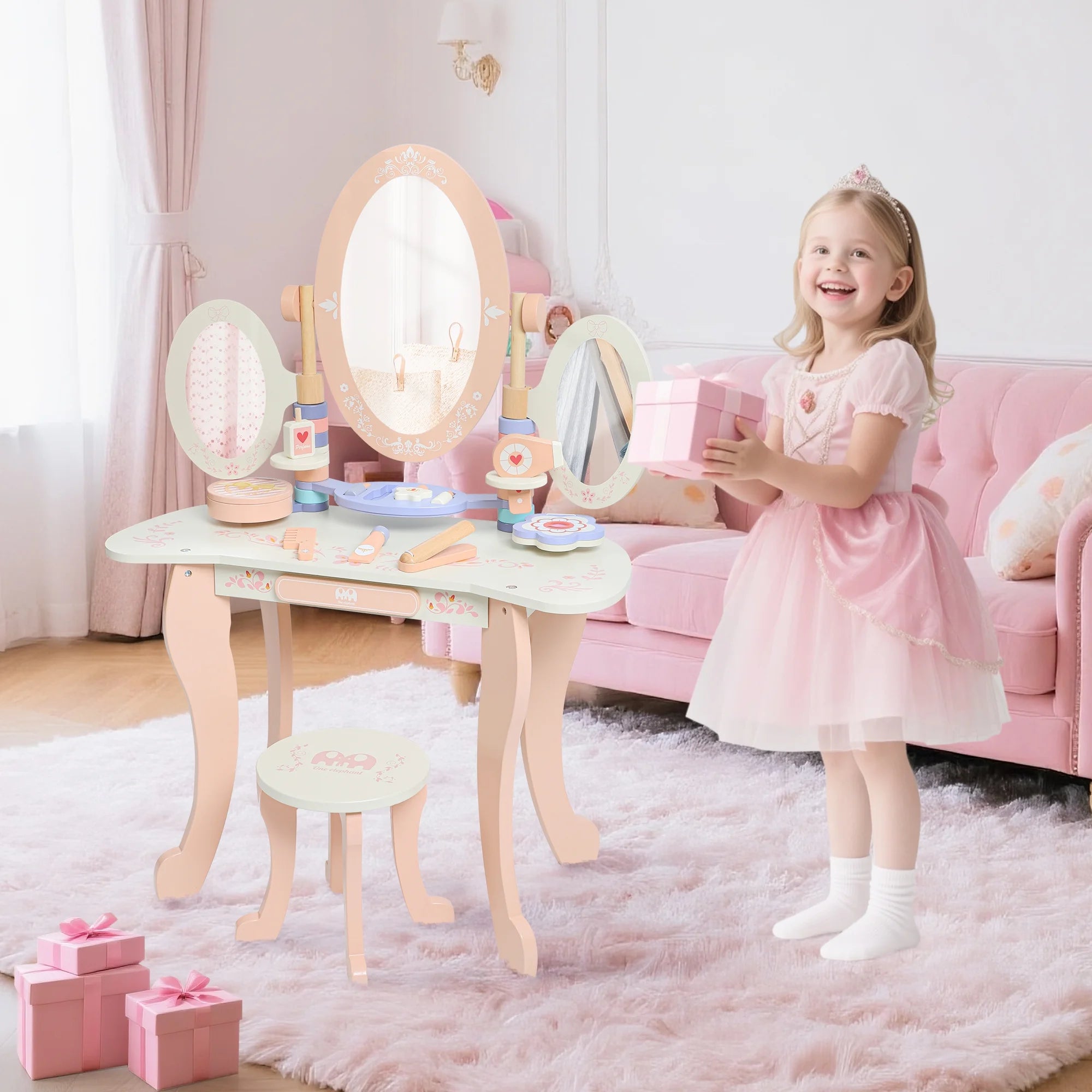 - Princess Vanity Set: Includes 3 mirror, padded stool, and storage drawer.