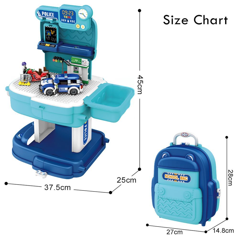 Little Story 219 Pcs Police Station Block School Bag is a great 2-in-1 modes Role Play Educational cum fun toy set for your li 'l one to improve their hands-on ability and develop imagination. In the Police Station, the kids can complete a police officer report, write speeding tickets, take mug shots, or collect fingerprints. There are so many fun printable included such as a police car and Bike. In the Detective's Office the kids can solve the case of who stole the cookie from the jar! This Police Station dramatic play center is a fun way for children to engage in pretend play and learn about Police role.