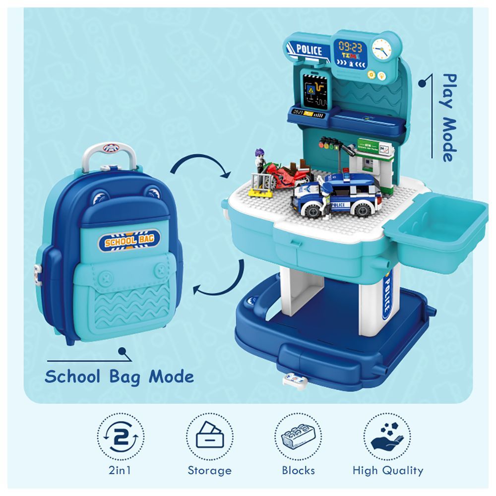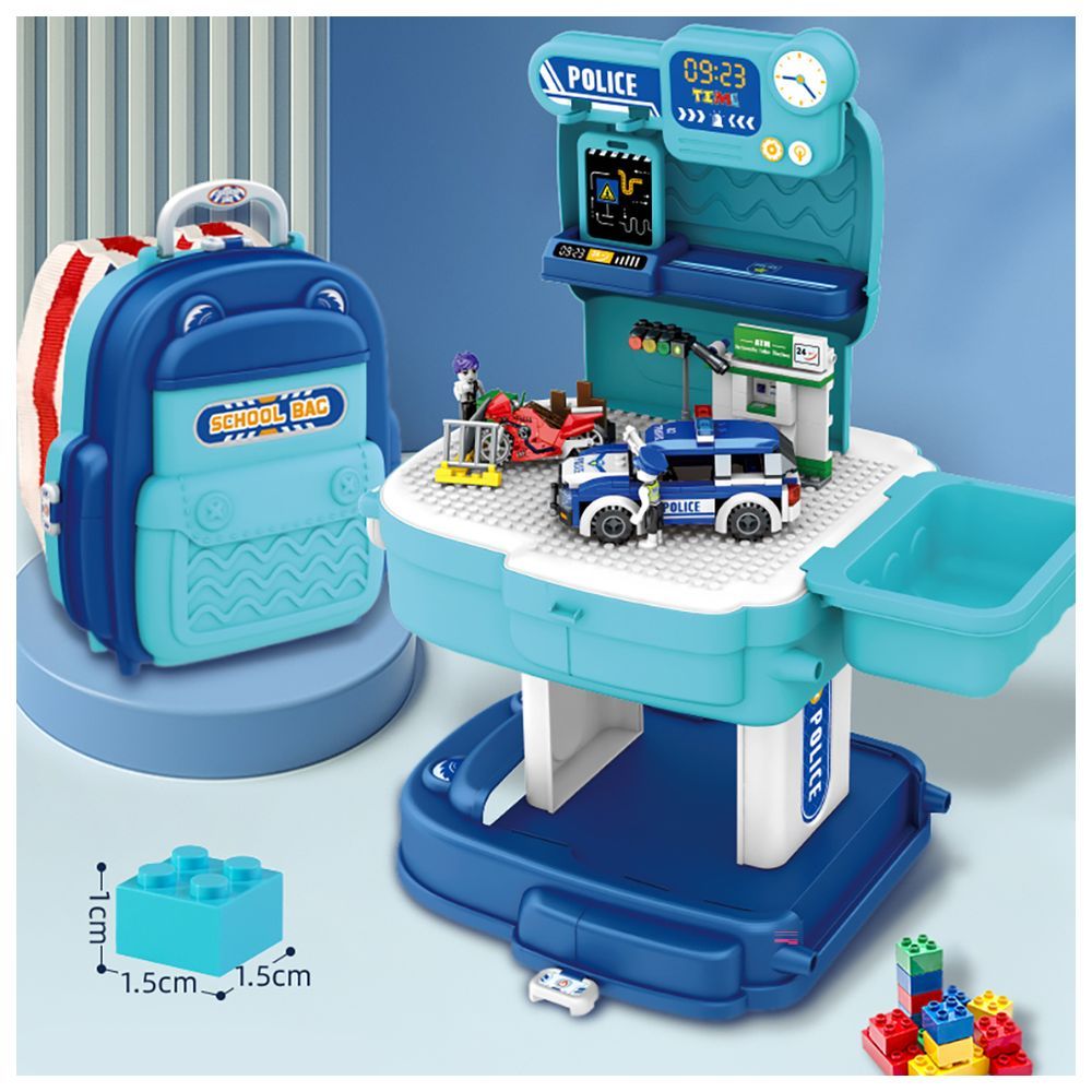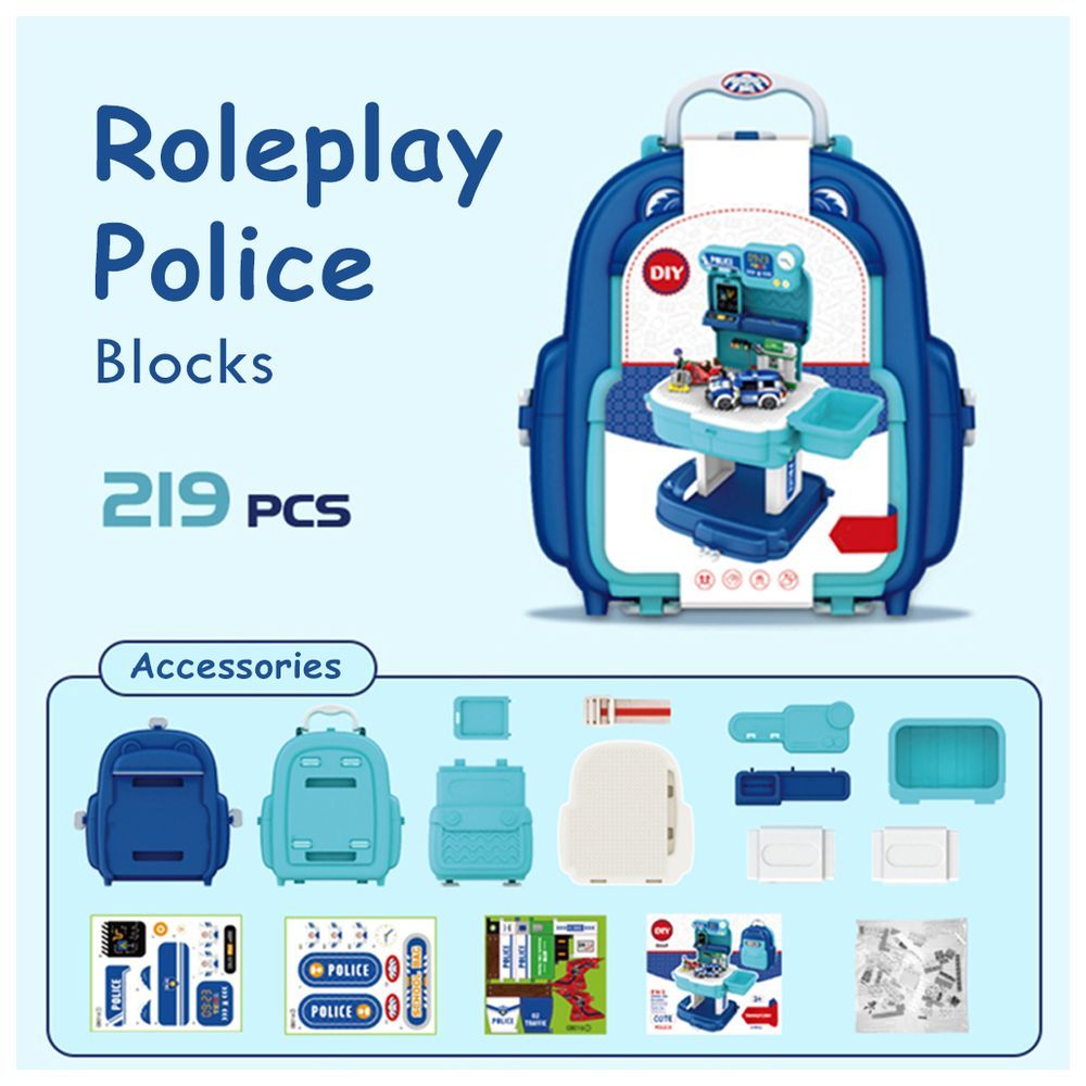 PACKING INCLUDES: , 1 x POLICE STATION WITH POLICE CAR AND BLOCK TOY SET SCHOOL BAG (219 Pcs)