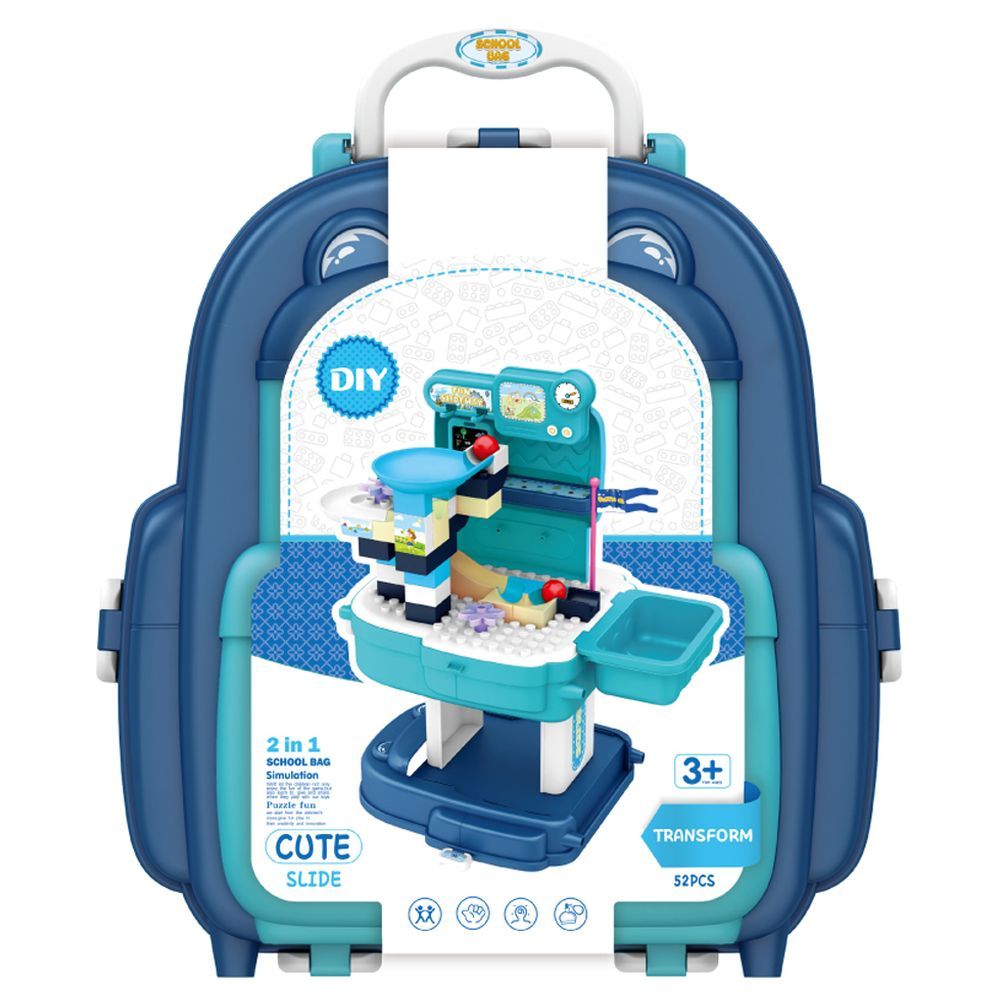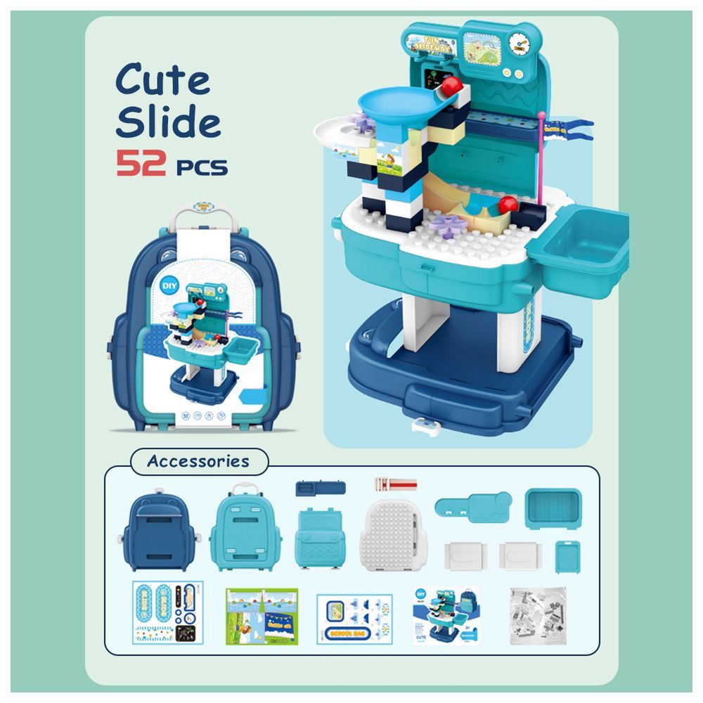 PACKING INCLUDES: , 1 x THEME PARK WITH SLIDE AND BLOCK TOY SET SCHOOL BAG (52 Pcs)