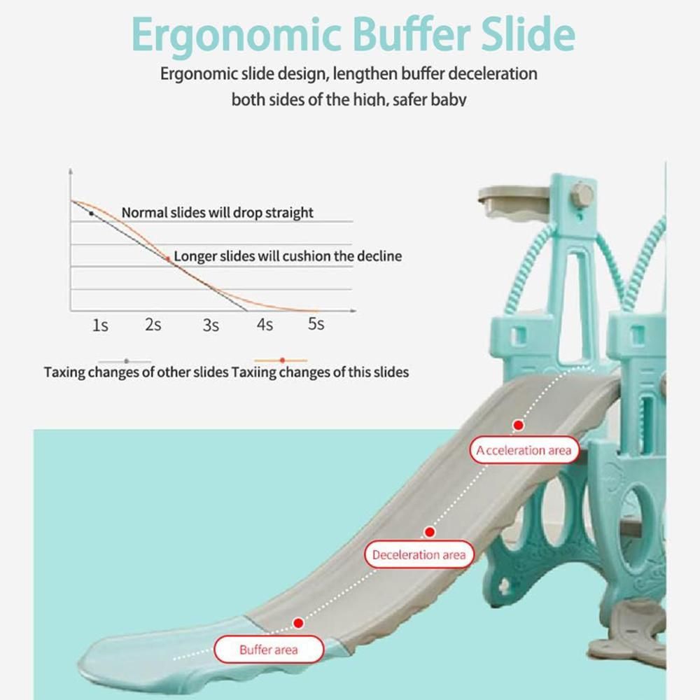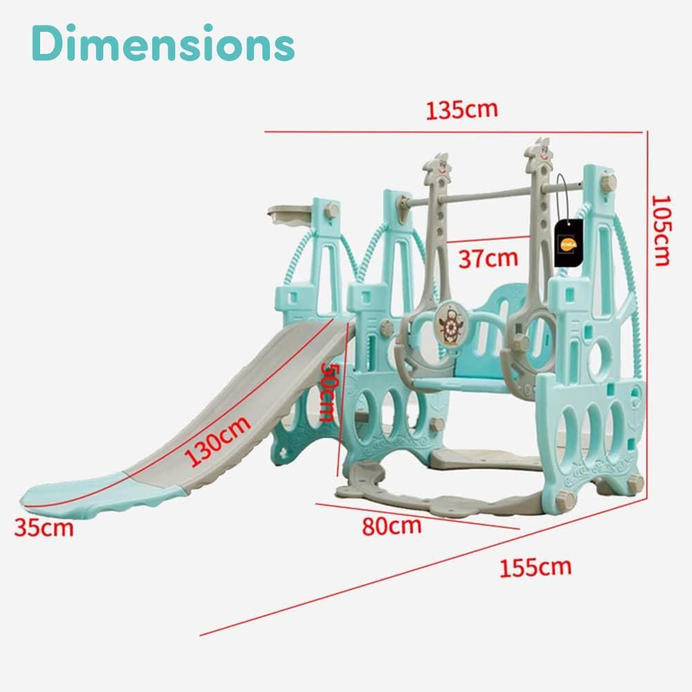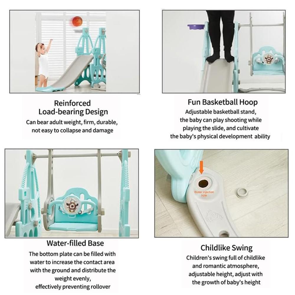 The Little Story 3-in-1 Swing with Slide in Green is a multifunctional playset perfect for children aged 1–6 years. It features a swing with adjustable height, a basketball hoop, climbing steps, and a smooth, wide slide with a buffered base for added safety. Made of eco-friendly HDPE material with rounded edges, it's safe and durable. Easy to assemble and fold, this playset suits both indoor and outdoor use. The 3-point harness on the swing adds extra protection. With a 50 kg max load, it helps kids stay active, coordinated, and entertained while having fun