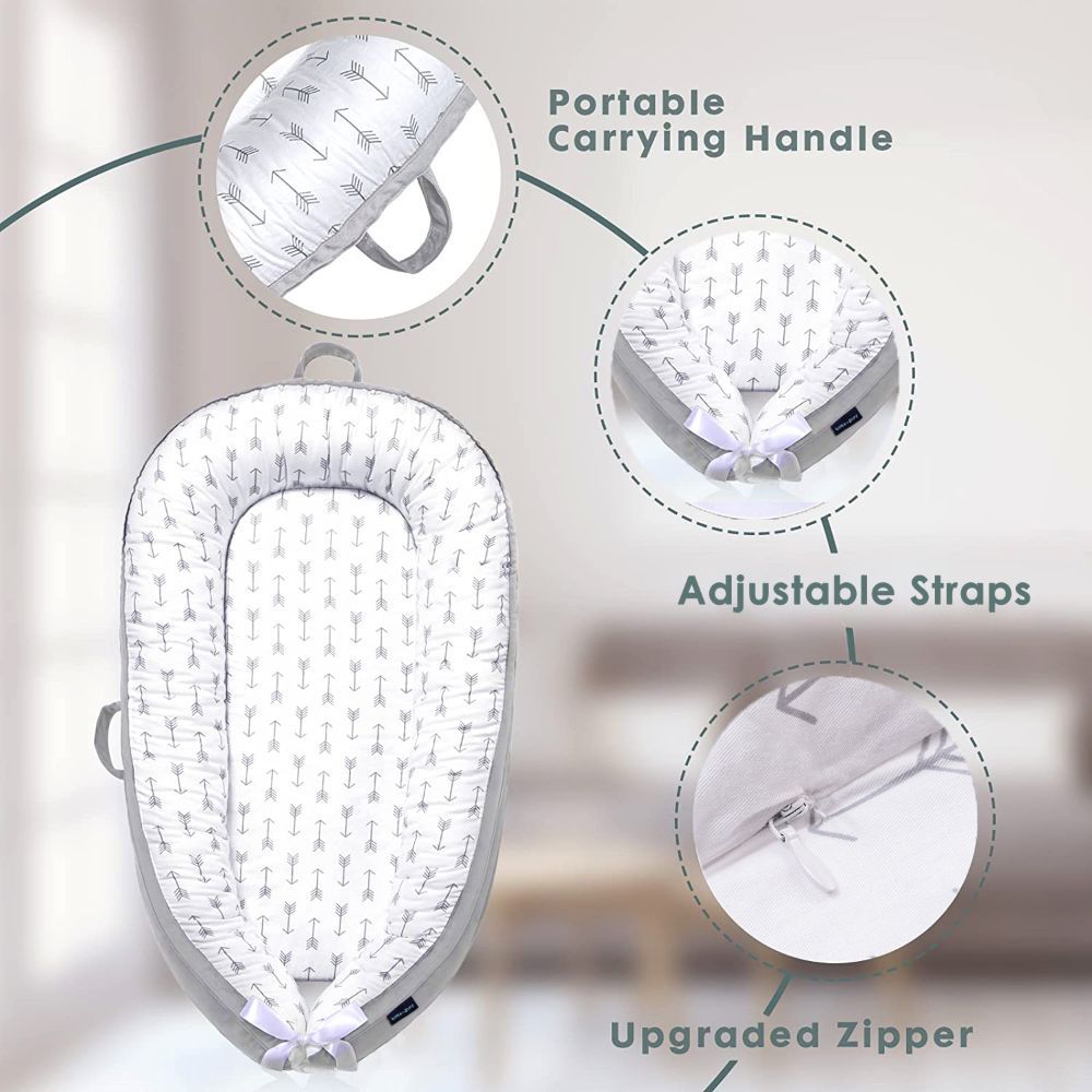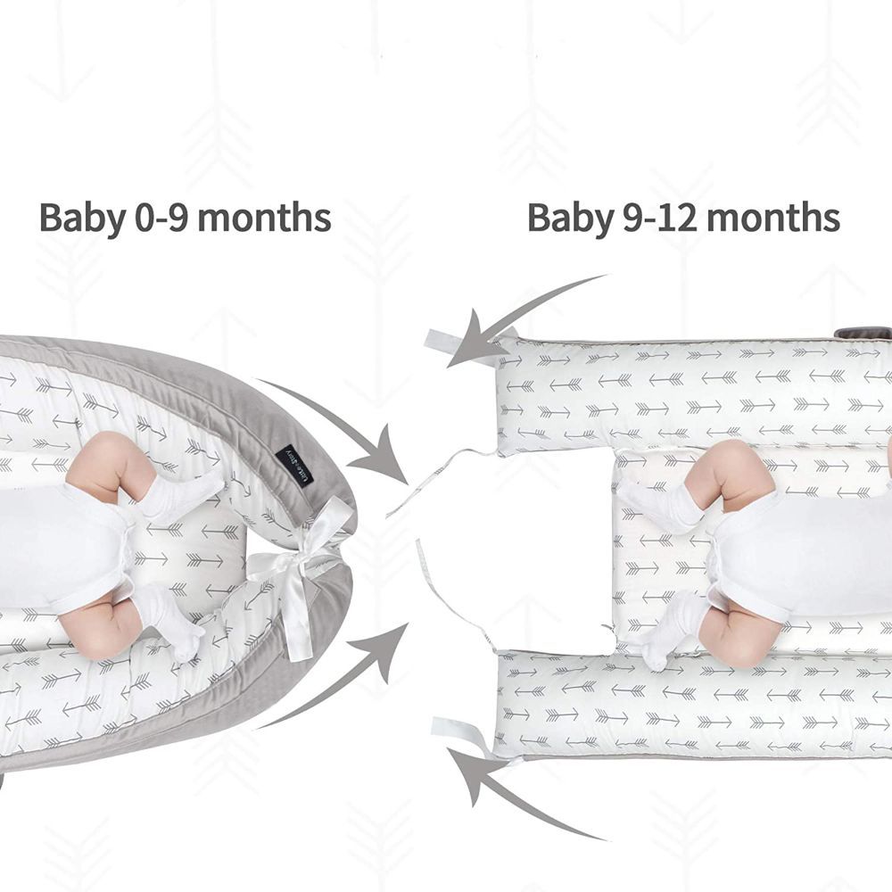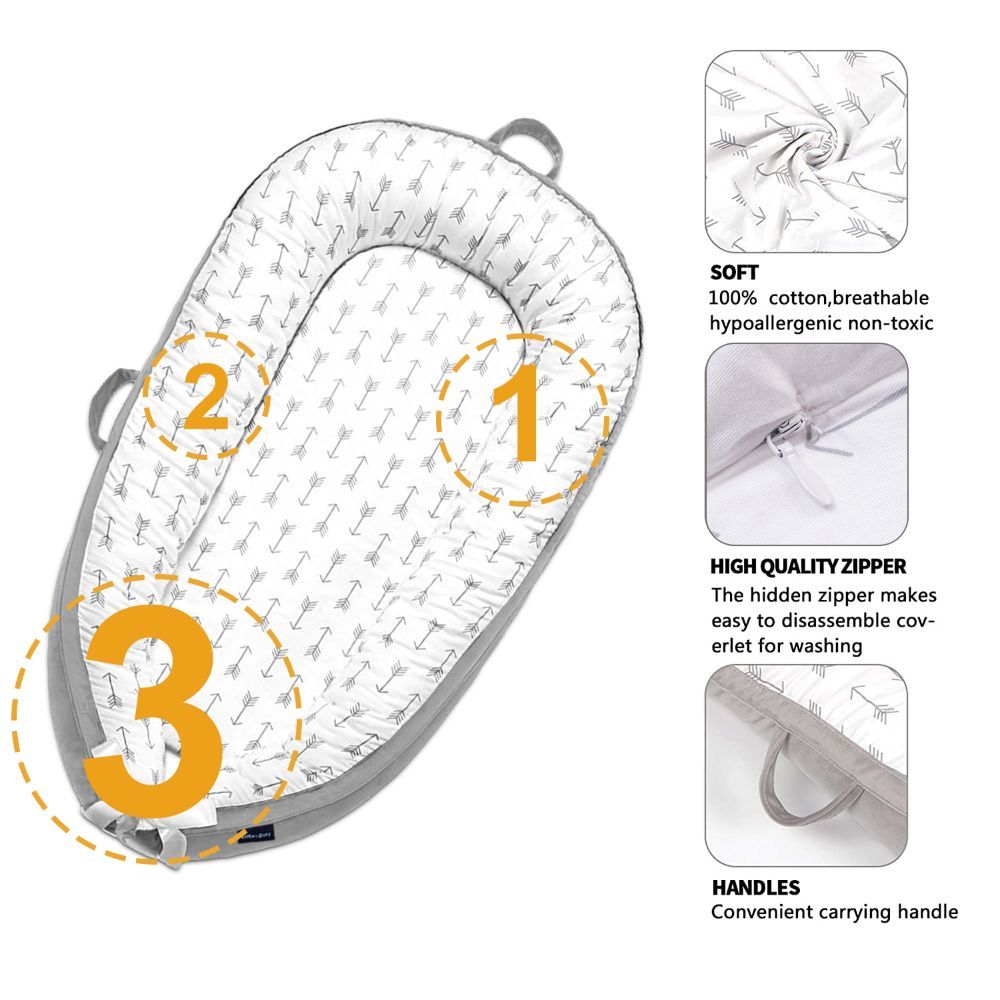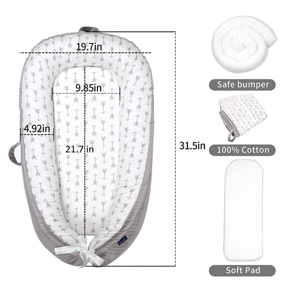 Little Story Soft Breathable Fiberfill Newborn Lounger Bed is made of 100% Cotton Fabric Cover for Tube and Pad & Fiberfill, with extra side-padding, 4cm mattress comes with infinity hidden Zipper, Comes with One side is arrow pattern, and the other side is solid grey so you can switch between the two patterns inside and outside. Adjustable, simply loosen the cord at the end of the bumpers to make the size larger. The ends of the bumpers can be fully opened. Babies snuggle nest sleeper is 90cm long and 50cm wide. We also added extra Cush to the base making it 4cm for optimal support, can use it as a travel baby bed at hard flooring or hotel beds. It makes the perfect lounger, rest spot, tummy time aid and travel mat, this is newborn essentials must haves. Baby lounger cover upgrade for breathable Covers so you can still use your portable baby bed even on laundry day. The Zipper allows endless zipping of the covers without any snags or breaking like other baby lounger sleeper due to thick binding. Easy to wash and support machine washable, covers of bassinet, outer ring and pad are all detachable. Perfect for Gifts to new moms, baby showers, kids' birthday, Christmas, and Halloween.