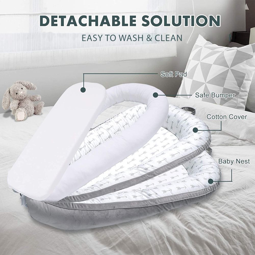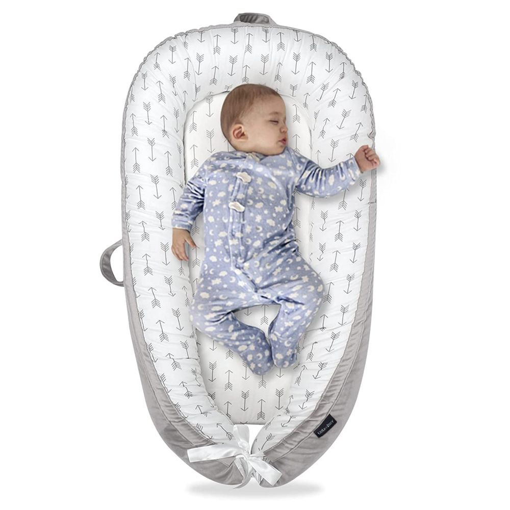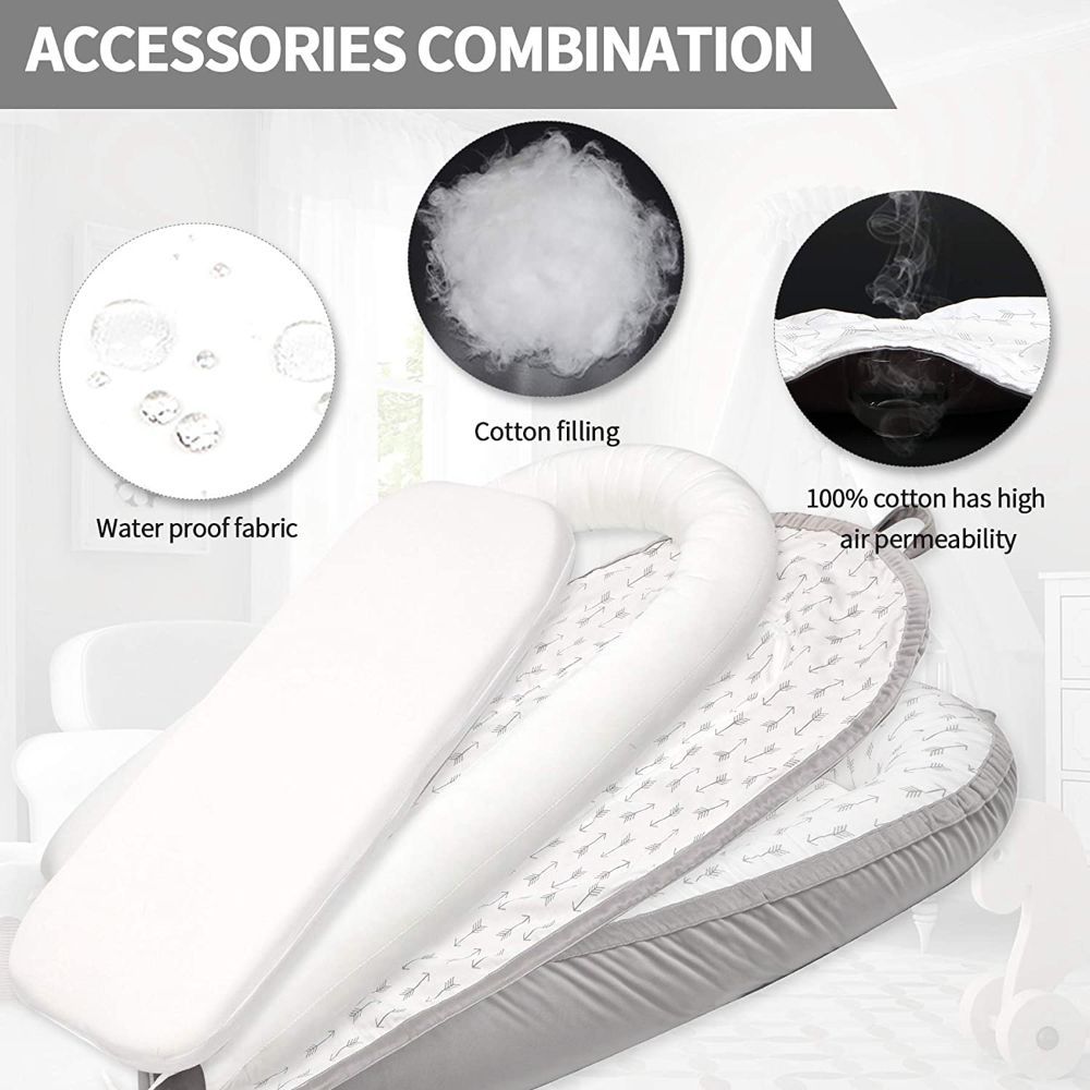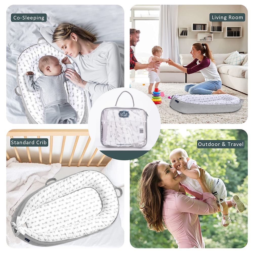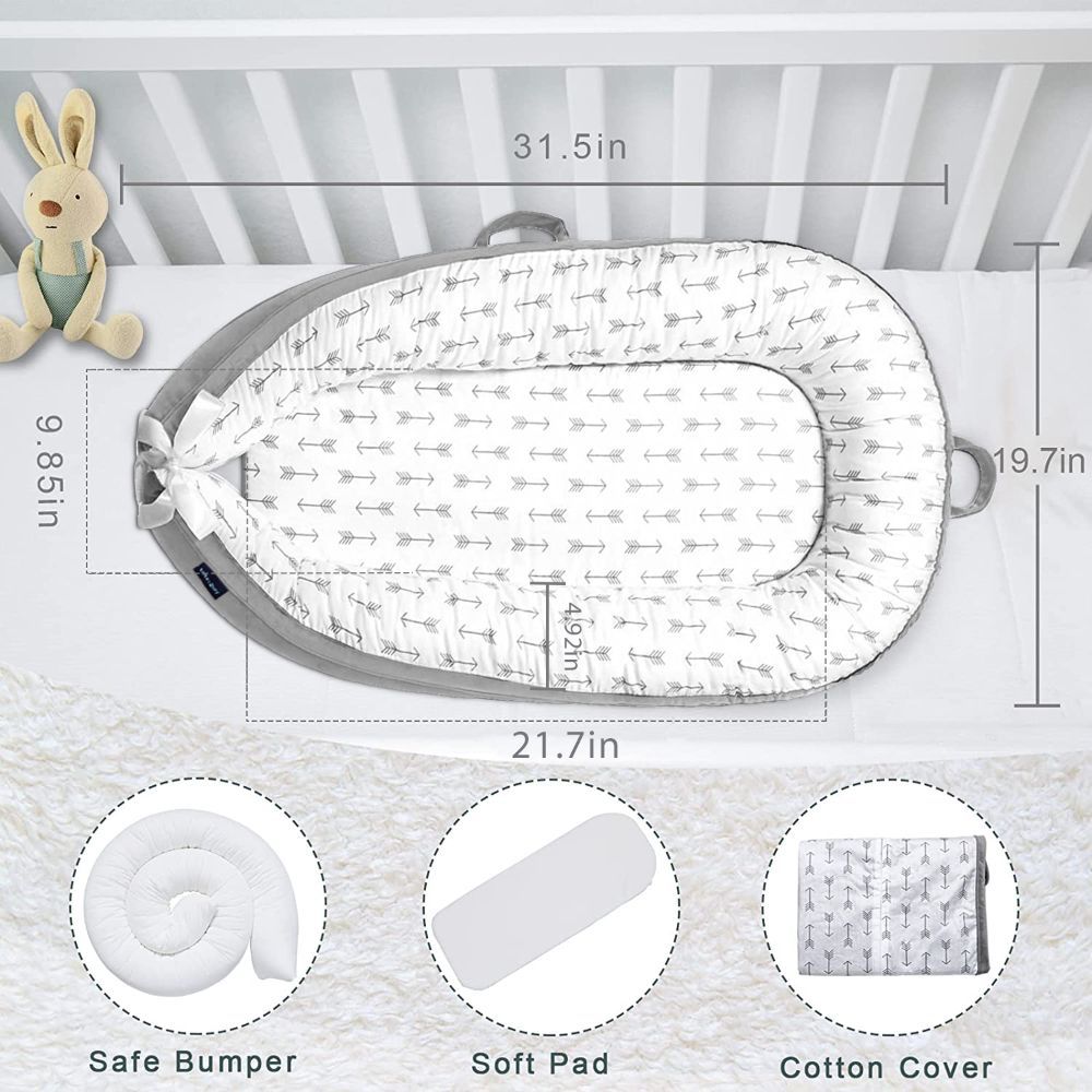 Little Story Soft Breathable Fiberfill Newborn Lounger Bed is made of 100% Cotton Fabric Cover for Tube and Pad & Fiberfill, with extra side-padding, 4cm mattress comes with infinity hidden Zipper, Comes with One side is arrow pattern, and the other side is solid grey so you can switch between the two patterns inside and outside. Adjustable, simply loosen the cord at the end of the bumpers to make the size larger. The ends of the bumpers can be fully opened. Babies snuggle nest sleeper is 90cm long and 50cm wide. We also added extra Cush to the base making it 4cm for optimal support, can use it as a travel baby bed at hard flooring or hotel beds. It makes the perfect lounger, rest spot, tummy time aid and travel mat, this is newborn essentials must haves. Baby lounger cover upgrade for breathable Covers so you can still use your portable baby bed even on laundry day. The Zipper allows endless zipping of the covers without any snags or breaking like other baby lounger sleeper due to thick binding. Easy to wash and support machine washable, covers of bassinet, outer ring and pad are all detachable. Perfect for Gifts to new moms, baby showers, kids' birthday, Christmas, and Halloween.