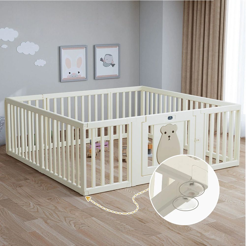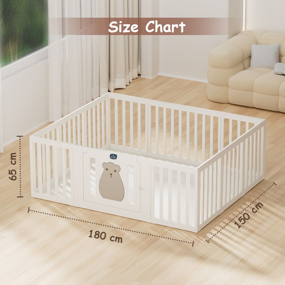 Introducing the Little Story Portable Playpen With Door. This amazing foldable Playard is perfect for moms looking to save space while keeping their baby entertained at home. With its special foldable feature, the play yard opens with a simple pop and is ready for playtime in seconds. Whether used as an activity center or a ball pit, it's ideal for both indoor and outdoor fun. The Little Story Bear Portable Playpen is a great gift for any occasion, providing endless fun and convenience. Set includes: 1 x Door panel, 1 x Big panel, 8 x Mid panel, 4 x Top corner buckle, 8 x Top straight buckle, 4 x Bottom corner buckle, 8 x Bottom straight buckle.