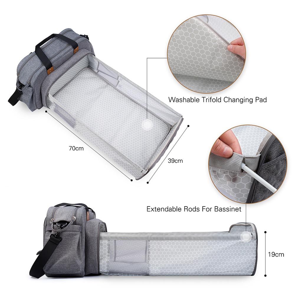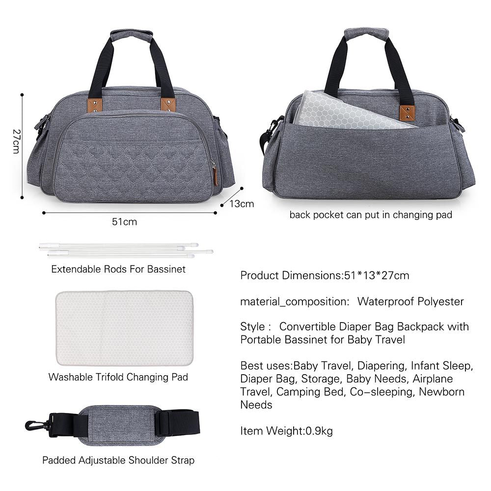- Pack includes: 1 Bag, 1 Handstrap, 1 Shoulder Strap, 1 Changing Pad, 1 Extendable Rod for Bassinet