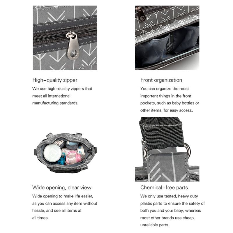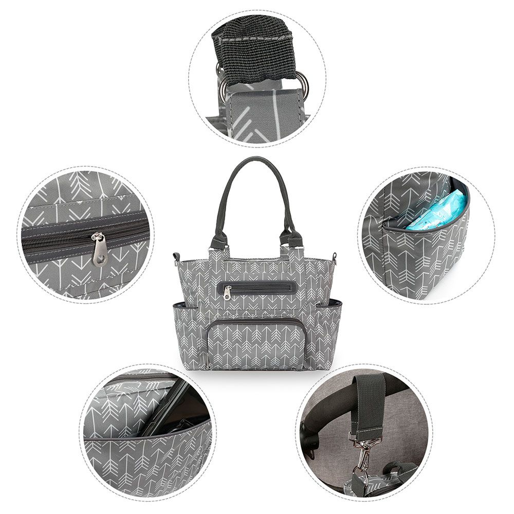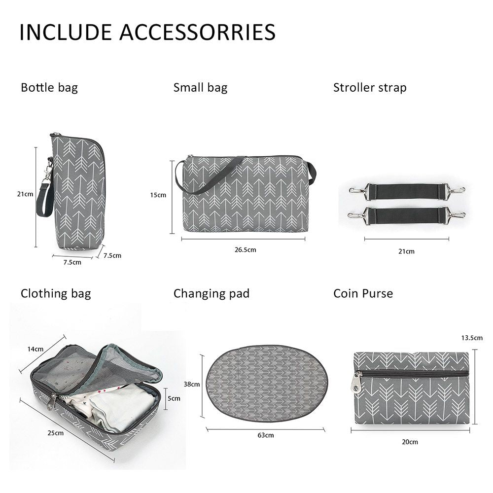 - Little Story Diaper Bag Set Includes: diaper bag, personal purse with carrying strap, changing pad, accessories bag, organizer bag with mesh top, insulated bottle bag, stroller straps