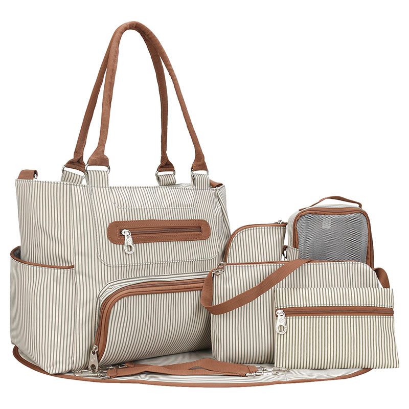Little Story Diaper Bag is a Fab Choice as a Nappy Bag for Moms juggling between tasks, home and kids. Each compartment and set item in this diaper bag set is designed to simplify your life as a parent. One extra large compartment fits your largest items while small pockets ensure you stay organized. Little Story Diaper Bag stands upright for easy access to main compartment while changing diapers for your little one. Centrally attached stroller straps lets the diaper bag hang straight down for easy access while attached to a stroller., Mix and match the parts of the set for each trip, whether going to daycare, work, or a day out. The main compartment is large enough to fit breast pump, extra diapers, bottles, wipes, etc. Many small pockets make sure you stay organized. The durable and stain resistant material means you don't need to worry about damaging it while on the go. Little Story diaper bag is versatile and can keep up with you. The lovely Ivory color and design makes it a Fashion Favourite choice. Use it as a tote, purse, stroller Organiser or a travel bag., Little Story Diaper Bag Set Includes a diaper bag, personal purse with carrying strap, changing pad, accessories bag, organizer bag with mesh top, insulated bottle bag and stroller straps.