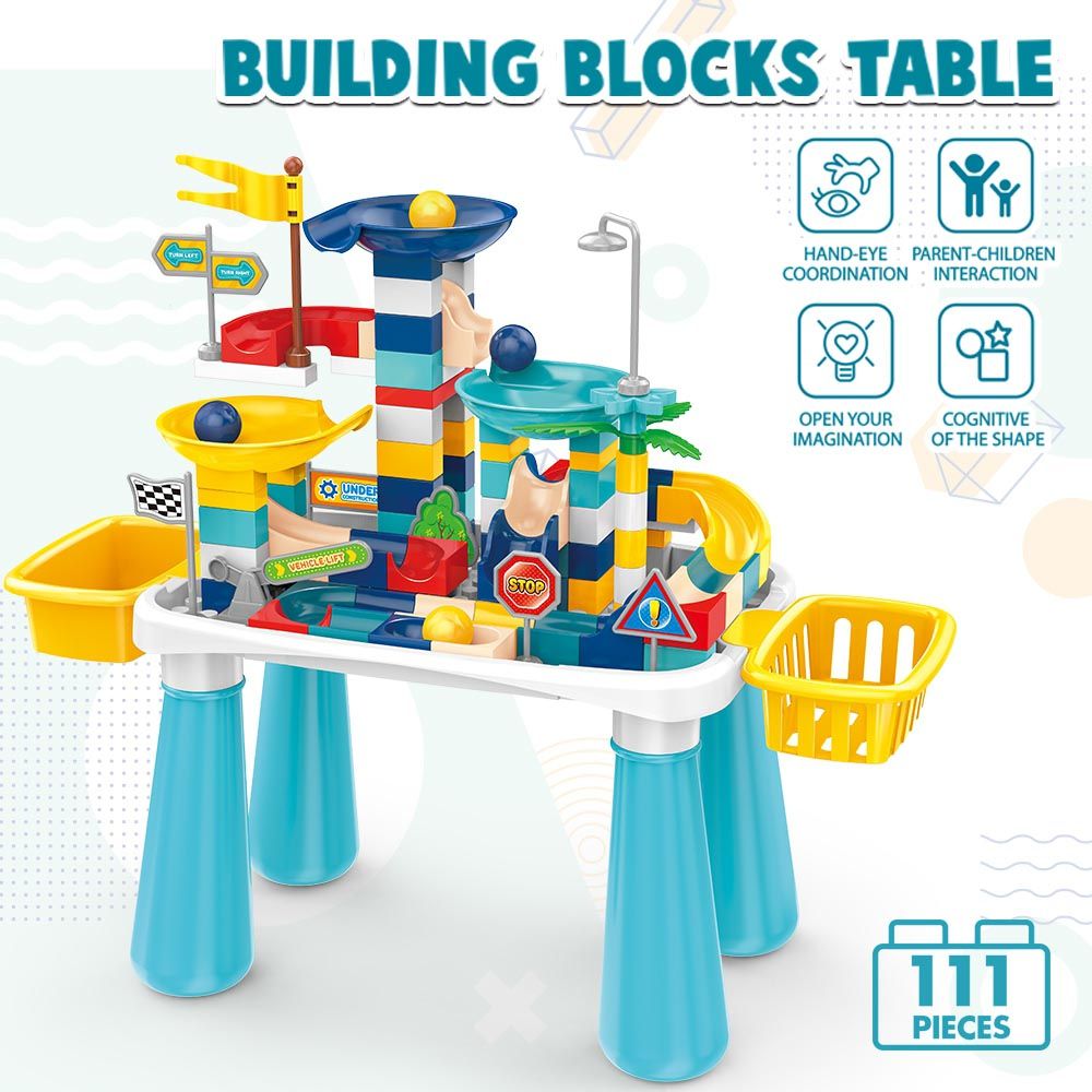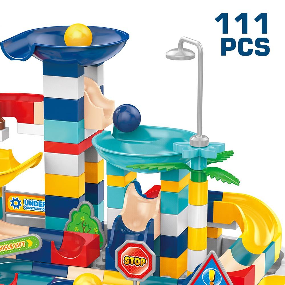 DIY Slide Track Rolling Ball Blocks Table comes with 111 pcs and can be setup as indoor and outdoor. Best for your li 'l one as birthday gifts, Christmas gifts, party gifts, Children's Day gifts, and New Year gifts.