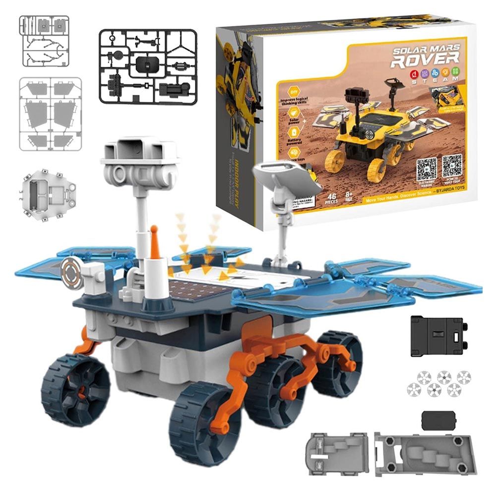 DIY self assembly toy with 46 accessories included in the Solar Mars Rover Kit, kids may freely explore their own environment and practice problem-solving skills. Dual Power Mode, Solar power or 1 AA batteries (not included). Can use it indoor or outdoor. Solar mars exploration rover is an awesome STEM Series present for your kids, so your children can enjoy adventure and let your child take a step ahead.