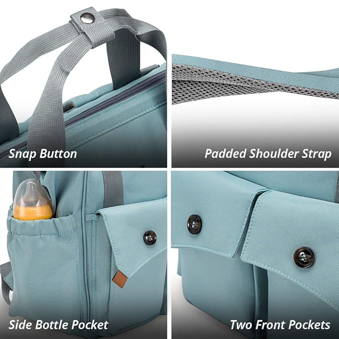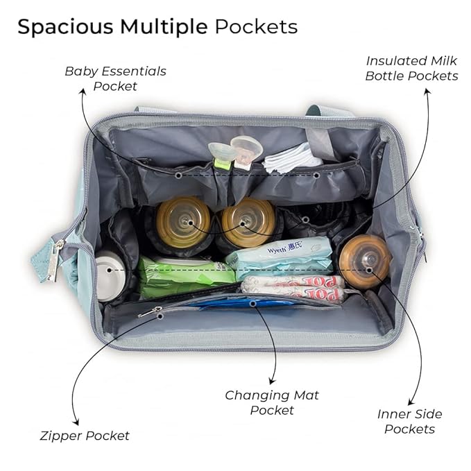 Lovely subtle colors and soft waterproof fabric is the first choice for all mums. All in all, Jumbo compartment with 16 pockets along with 3 Zippers are what a perfect organizer handbag style should have. Two Big sideways pocket to keep things in place. The three internal pockets have insulated bottle holders to keep the food cool or warm. The front pockets have enough space to keep additional bibs, spoons, or soothers. Keep yourself hands free with detachable stroller hooks which comes free with the bag and Diaper changing Mat. Breathable Padded shoulder and back makes it very comfortable during your travel with Antitheft hidden Zipper Pocket at Back. Perfect for Gifts to new moms, baby showers, kids' birthday, Christmas, and Halloween.