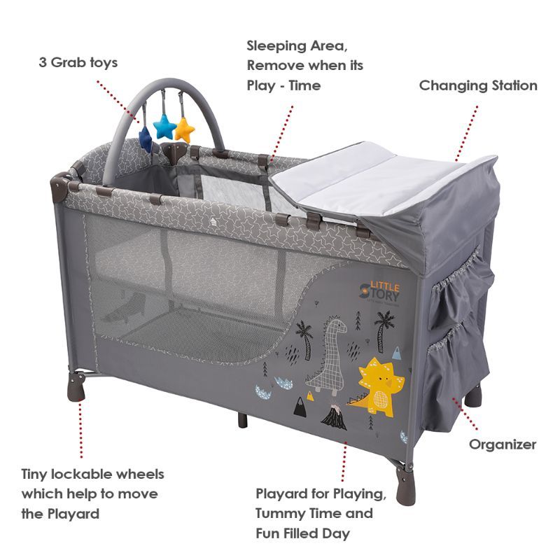 - The Little Story Foldable Cot and Playard is a versatile all-in-one baby furniture piece that functions as a cozy sleeping cot, fun playard, and convenient changing station—perfect from newborn to toddler years.