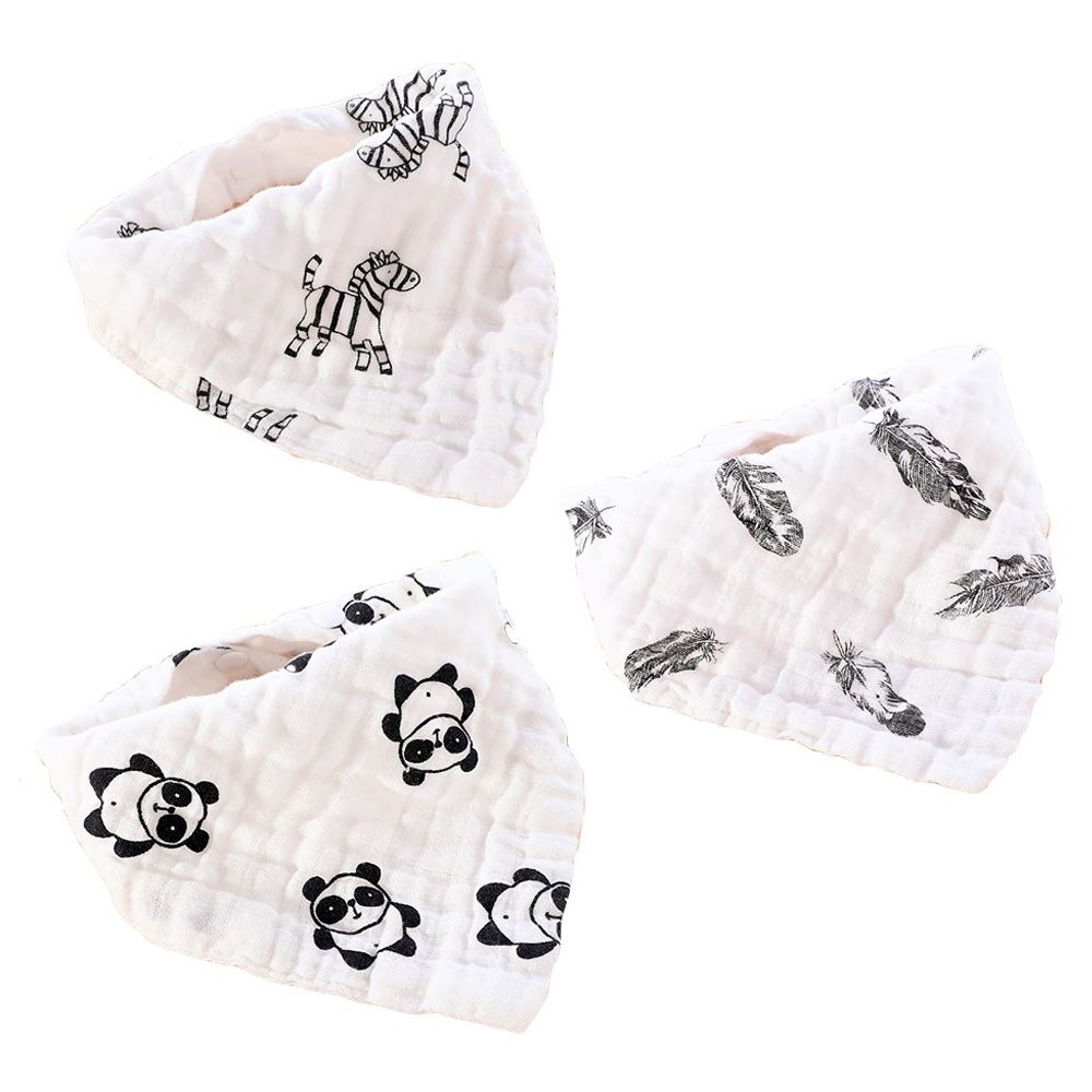 Our Exclusive range of Organic Cotton Muslin Bandana Bibs are super soft and have adorable designs. These organic cotton made bibs are soft on your little one's tender and delicate skin. Comes in a set of 3 with different styles which compliments to your baby's dress! Black and White colours with fun designs are unisex and a perfect gift for boy and girl both. ,