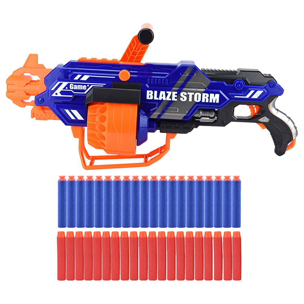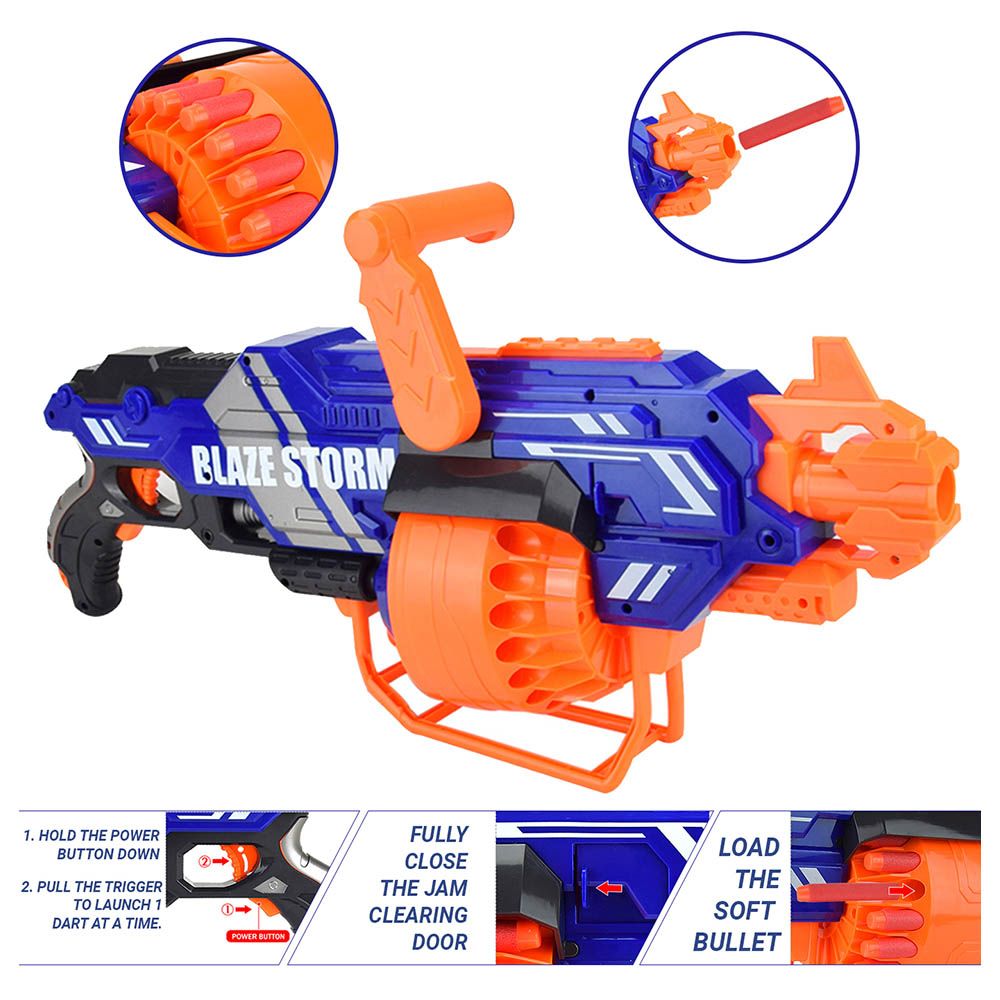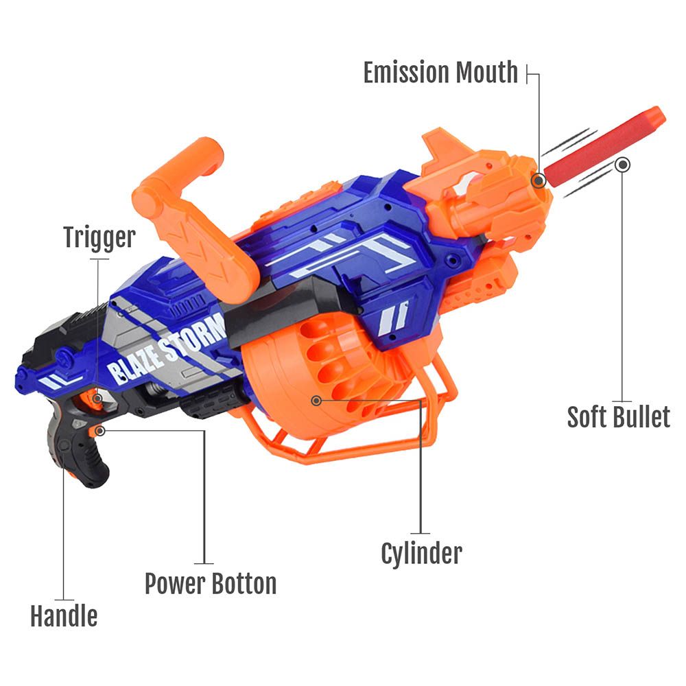 Little story Kids Battery Operated Bullet Gun comes with 40 pcs of soft bullets. Soft Bullet Gun is very easy to operate. Kids will love to fire soft foam bullets and suction darts and hit imaginary targets. It is super exciting and super cool shooting fun for the whole family; right in the cozy indoor suitable for kids Load soft foam bullets and fire away. Great for little hands. Big enough for both kids and even adults! Play and compete with friends and family!
