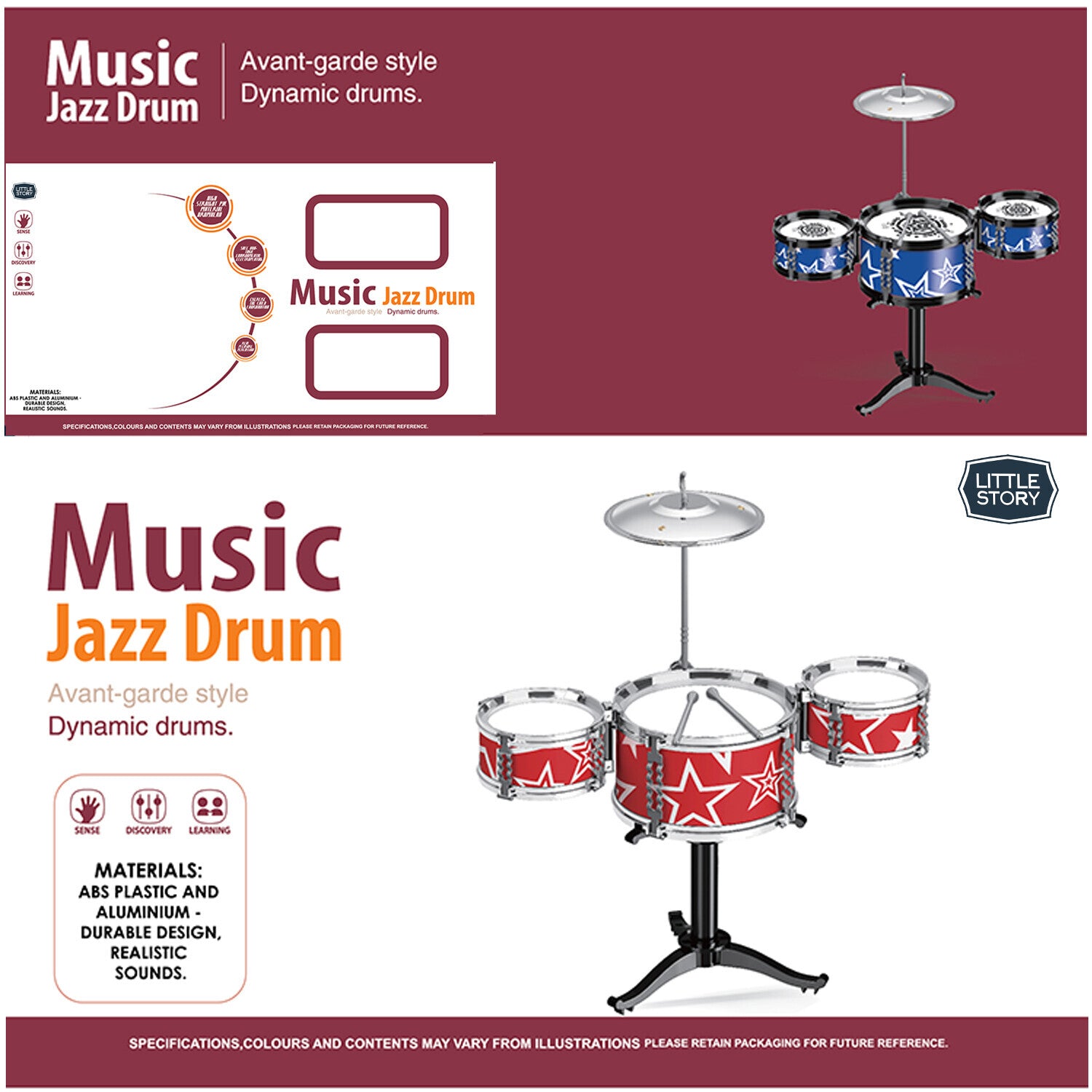 Let's Rock n Roll with Little Story Lids Drum Set Musical Instrument. Kids jazz drum set included 3 drums, 1 cymbal and 2 drumsticks. This kids drum set can help children improve their sense of music while enhancing their attention span and memory at the same time. Since kids can easily break things, this drum set has been made to be strong and sturdy, so that kids can enjoy using it for a long time. The drum set is ABS environmental material, with high quality PVC drum surface, bright color, lovely design and interesting sound effects, can focus children's attention.