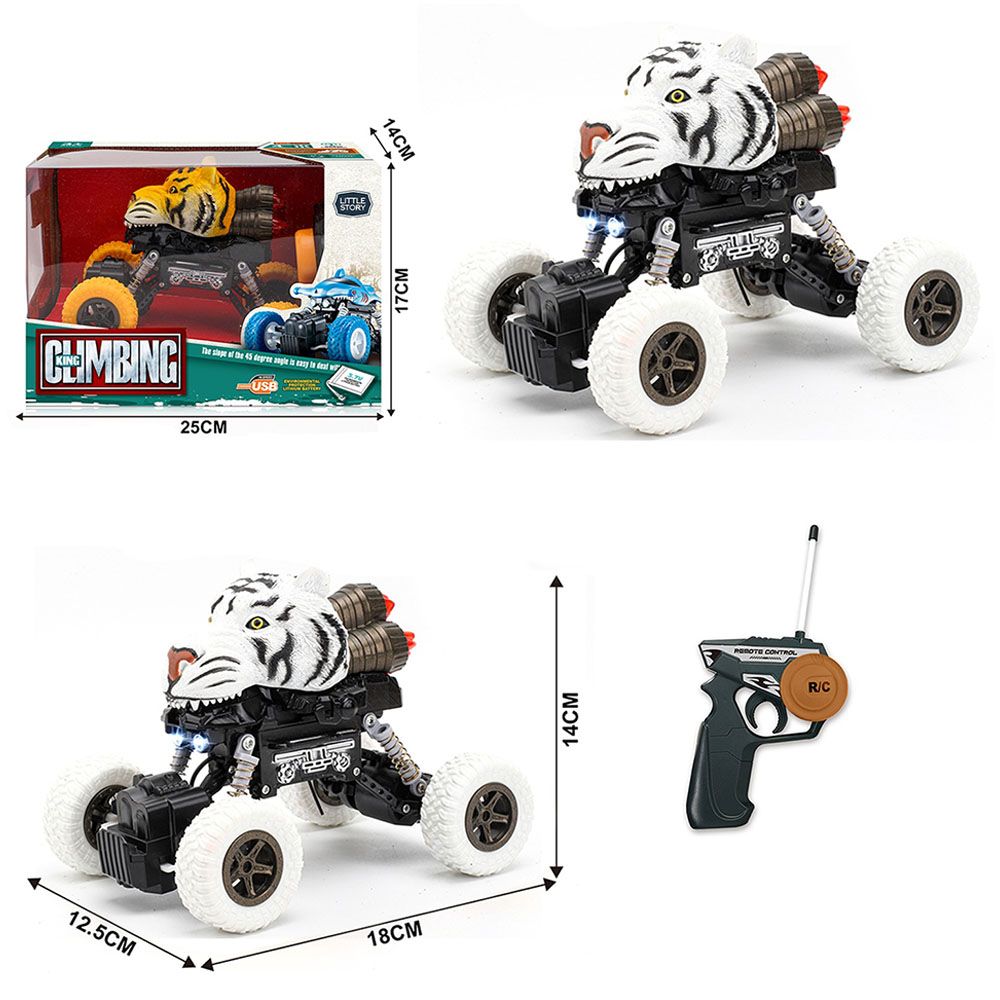 Little Story Kids Toy Tiger Car comes with 4 shock proof wheels and Remote Control with Rechargeable Batteries. The Kids Toy Tiger Car can eliminate the vibration of uneven roads and make the driving smoother. No batteries needed. It provides unique design and very realistic and cool look, perfect for kids. The Jeep is made of high-quality ABS plastic material, environment friendly durable safe to use. The climbing car suitable for group play and little competition between kids. These car toys are perfect for birthday gift or Christmas occasion present in the holiday season.