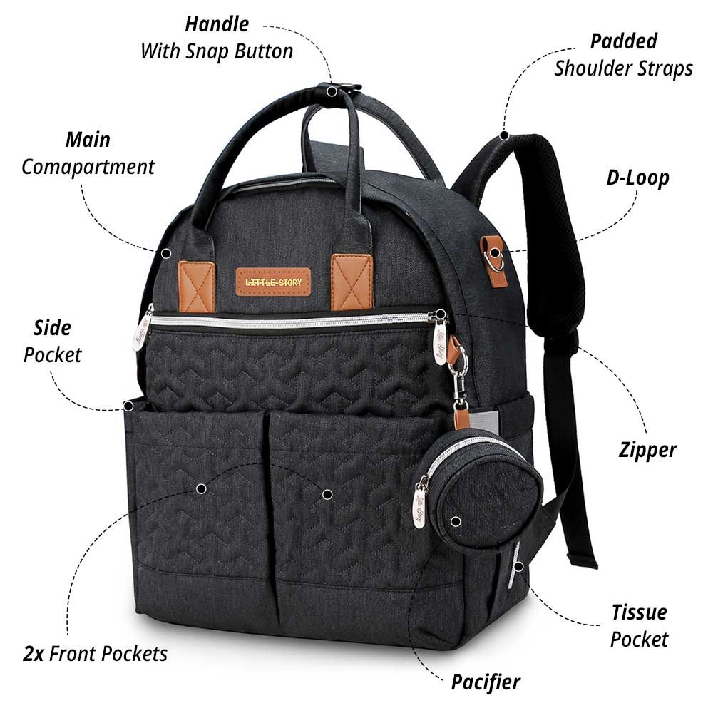 PACKING INCLUDES: 1 x Little Story Rugged Diaper Backpack, 1 x Pacifier bag, 1 x Pair of Stroller hooks