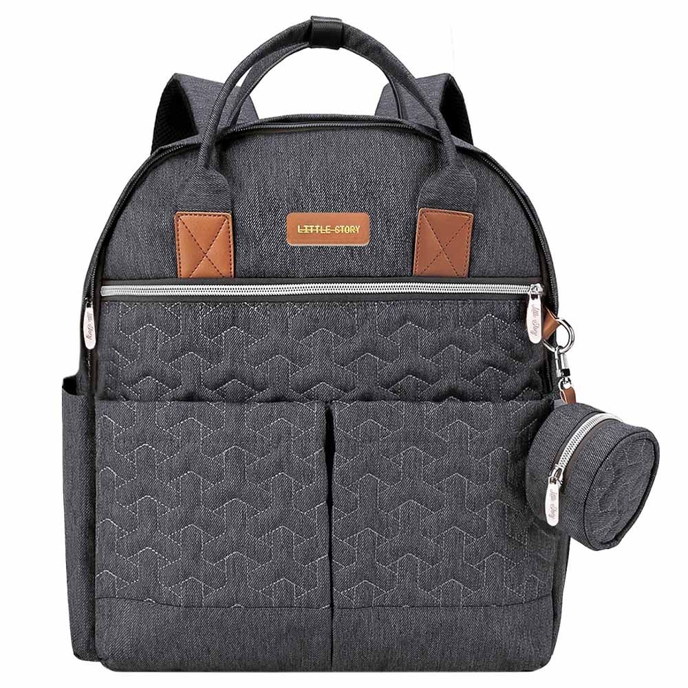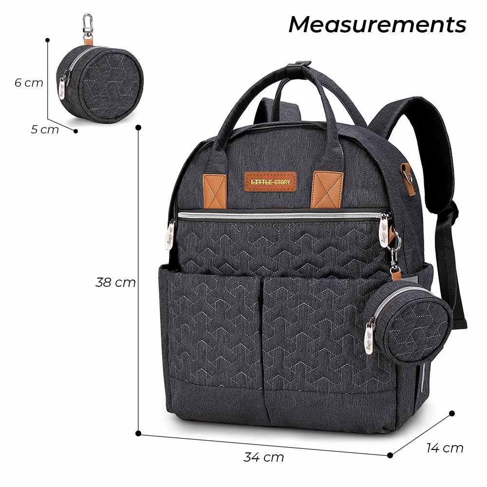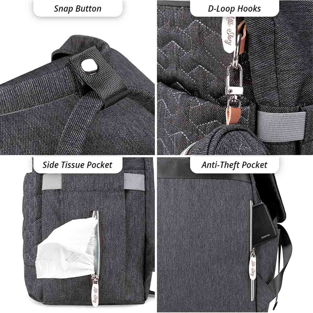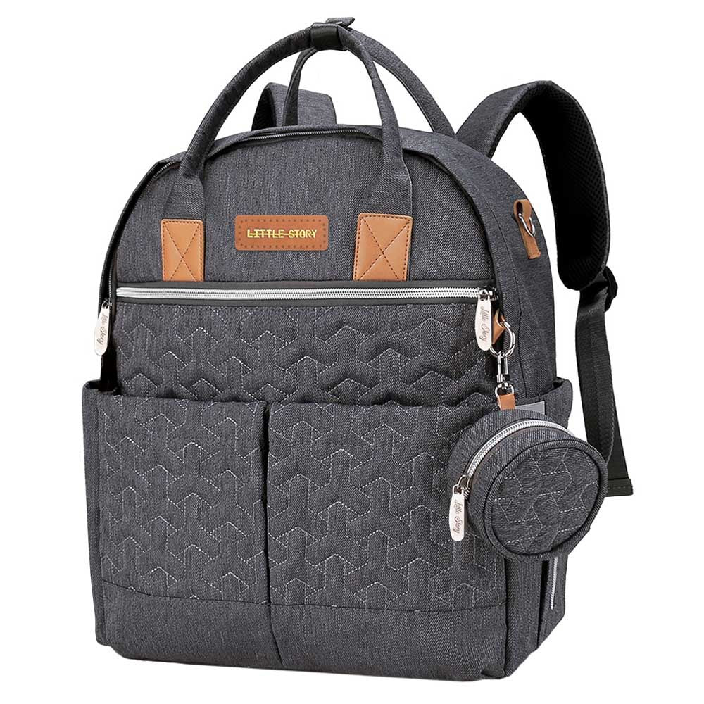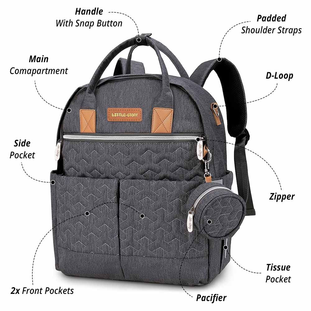 Little Story Quilted Diaper Backpack with Pacifier Bag And Stroller Hooks - Grey