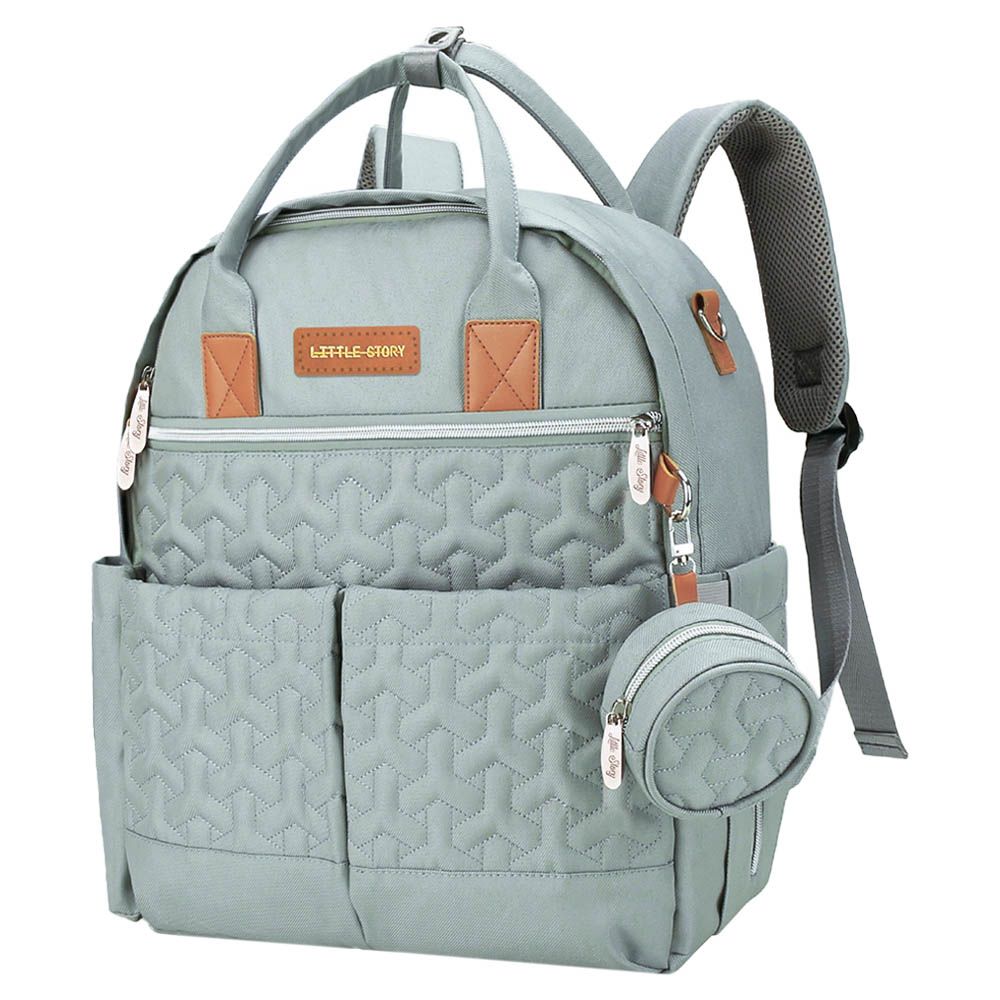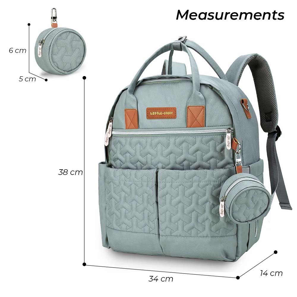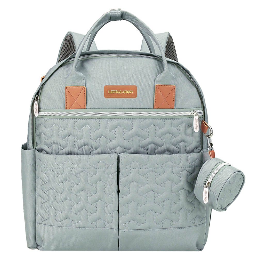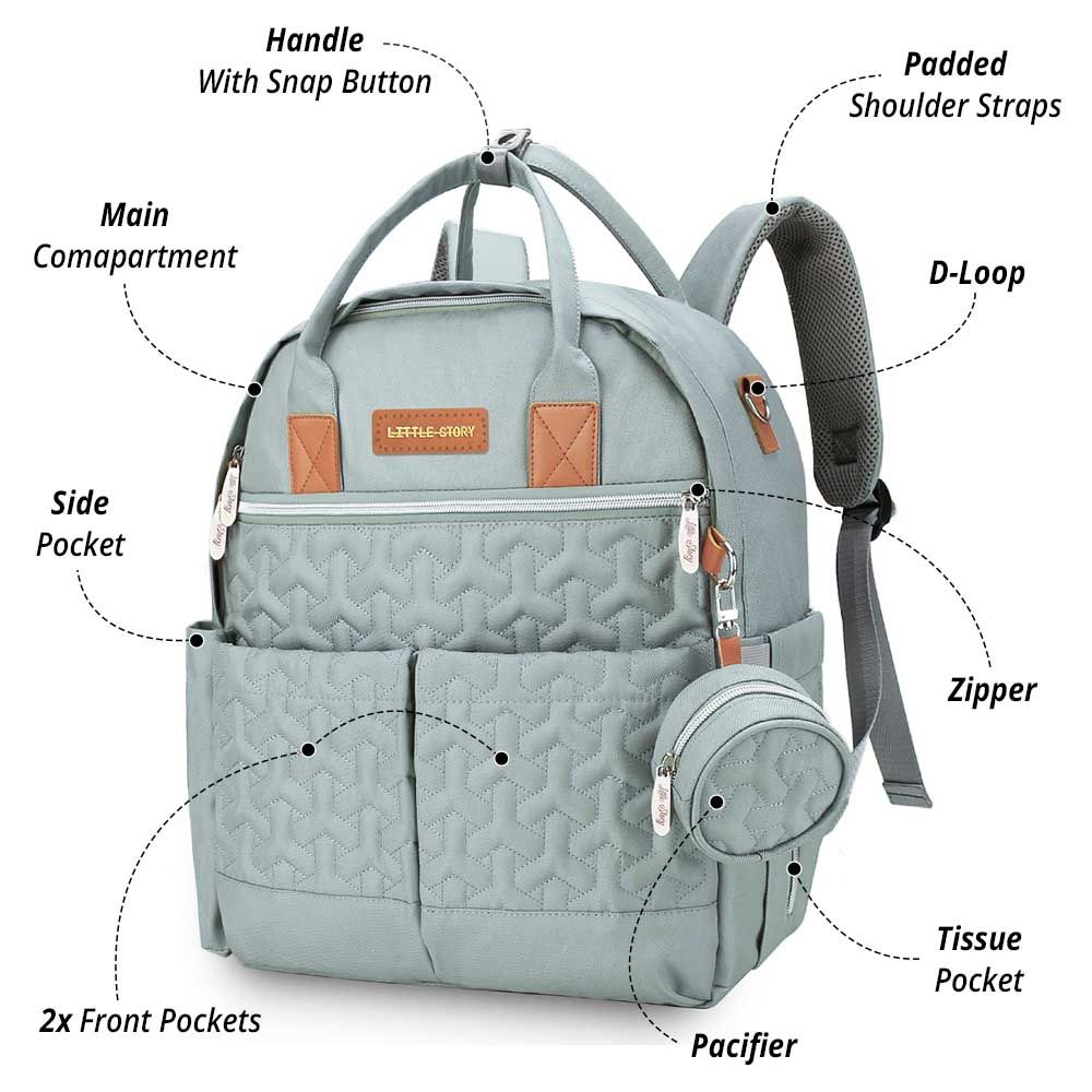 Little Story Quilted Diaper Backpack with Pacifier Pouch and Stroller hooks is a diaper bag which provides both functionality and style. This gorgeous Bag Flaunts Maternity Messenger style and also a Backpack style. Great colors and soft waterproof fabric is the first choice for all mums. All in all 3 compartments with 12 pockets are what a perfect organizer backpack should have! Two side ways pocket to keep tissues handy.