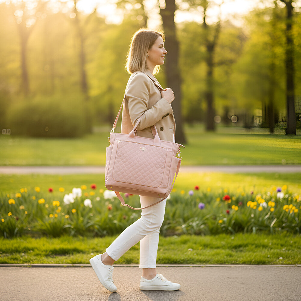 Stay effortlessly stylish while keeping everything your baby needs right at your fingertips with the Little Story Quilted Mommy Diaper Bag with Changing Mat – Pink. Thoughtfully designed for modern moms, this elegant bag that combines premium aesthetics with everyday functionality. With a roomy 20.9L capacity, this bag easily holds diapers, bottles, clothes, and other baby essentials while maintaining a sleek, fashionable look that pairs beautifully with any outfit or stroller.