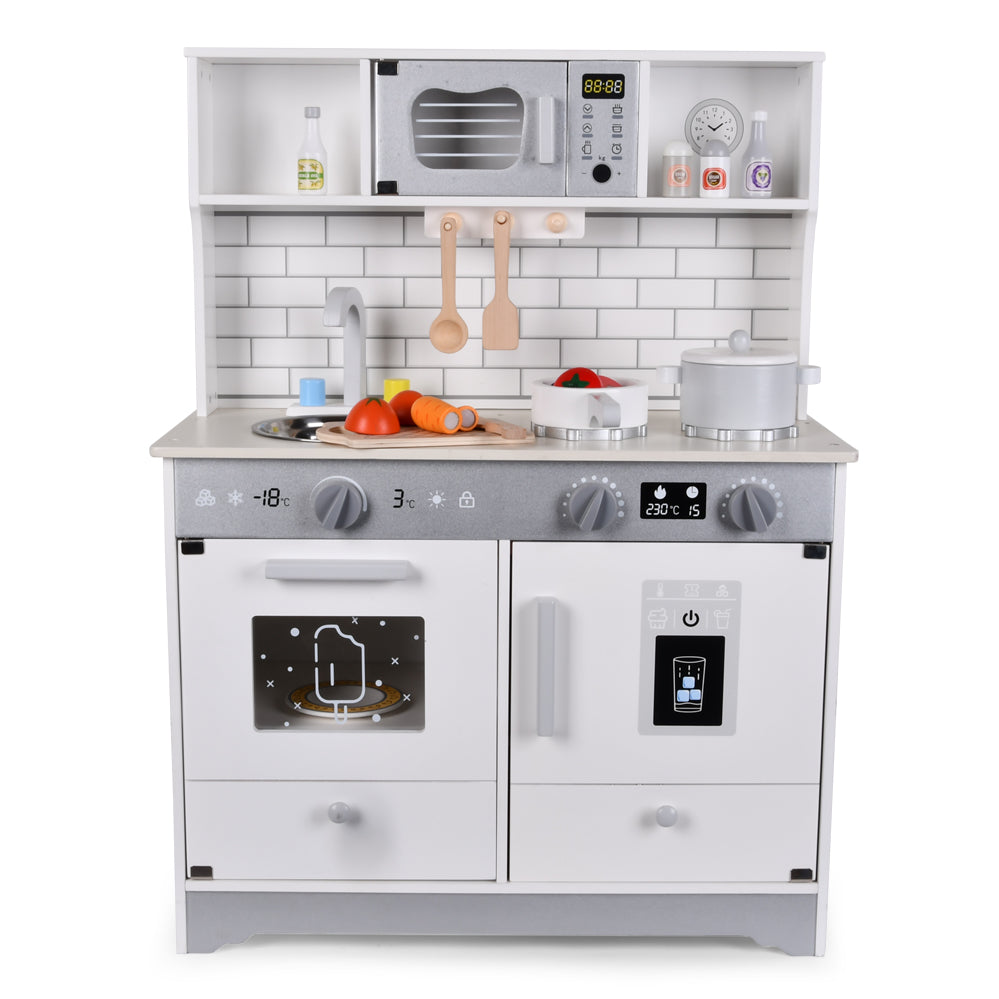 Built with premium MDF wood and durable plastic, this play kitchen combines sturdiness with safety. The smooth finish and rounded corners ensure worry-free play, while the elegant white design adds a stylish, modern touch that perfectly fits any playroom or nursery. With ample space for storage and realistic details, it delivers both fun and functionality.