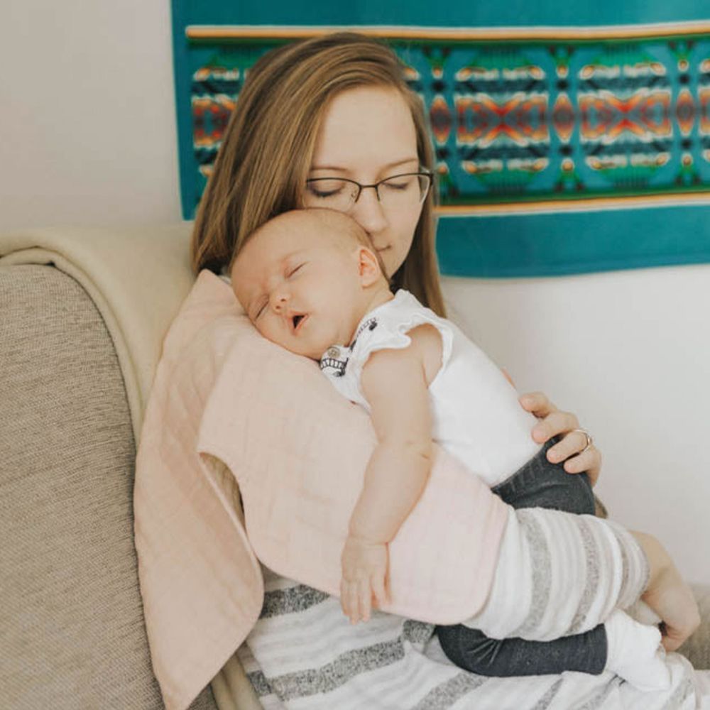There's no use crying over spilled milk. With 4 absorbent layers of cotton muslin and an innovative shape, our burp cloth keeps you clean and dry while baby's snuggled tight.