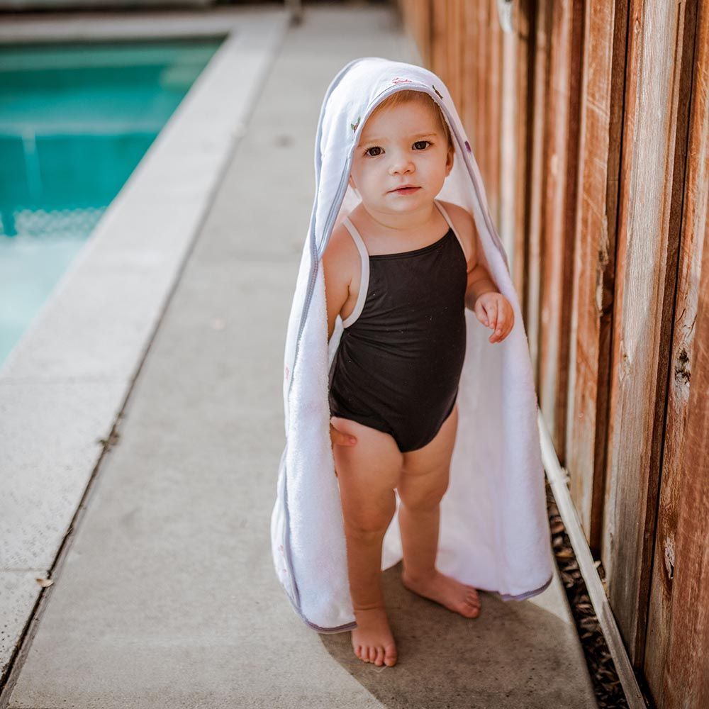 Bath towel with printed cotton muslin on one side and ultra-soft terry cloth on the other; a cozy hood and pockets for little hands. Care: Wash before use. Machine wash cold with like colors. Wash with like items. Use only non-chlorine bleach when needed. Tumble dry on low heat. Do not iron.