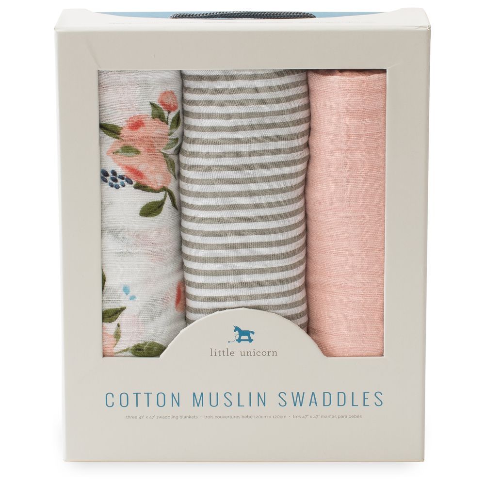 - Set of 3 soft, breathable swaddling blankets, each measuring 47" x 47".