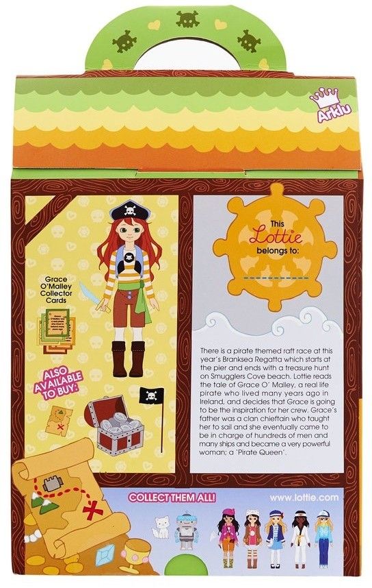 Lottie Pirate Queen doll is a 7.5 inches (18 cm) tall doll inspired by the legendary female pirate Grace Oƒ??Malley. The doll has a unique and detailed design, including a pirate outfit with an orange and white striped shirt, black boots, a blue waistcoat, brown shorts, and a black pirate hat. The doll is made of high-quality materials and is designed to encourage imaginative play and learning about history and culture.